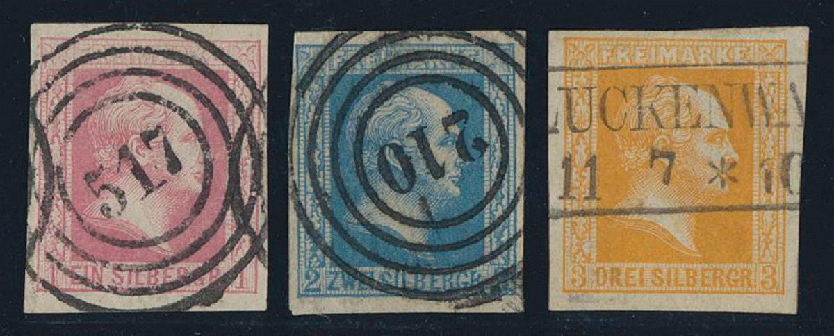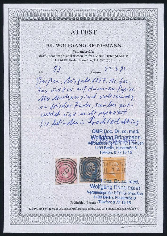 | Zusatzinformationen und Suchstichworte: | 80. HBA Auktion 9. - 12. November 2022 Los 952 (D) Altdeutschland Preussen 1857, 1 Sgr., mittelkarminrot, 2 Sgr., kobalt und 3 Sgr., dunkelgelblichorange, je dünnes, durchscheinendes Papier, je allseits voll- bis breitrandig geschnitten, je sauber gestempelt, je tadellose Kabinetterhaltung, gepr. Dr. Bringmann mit Fotoattest, Mi. 1030,-- Ausruf 250,00 EUR |