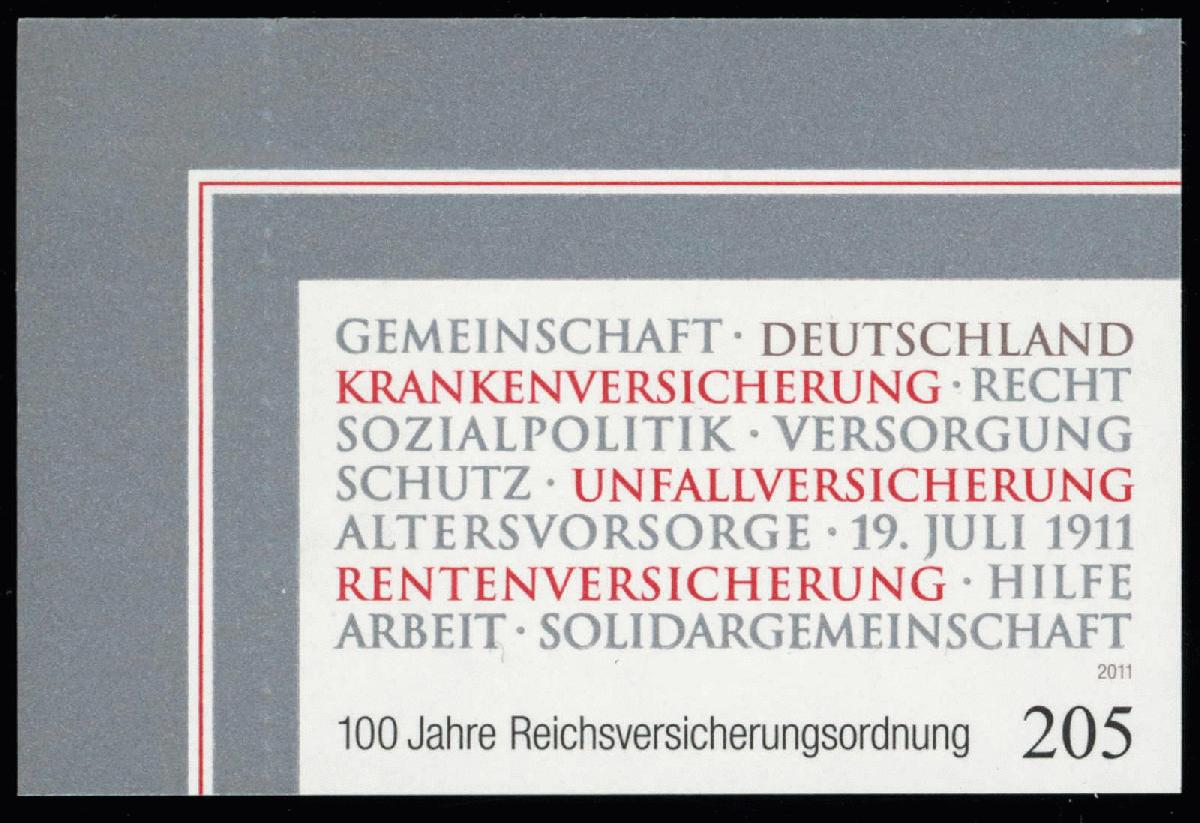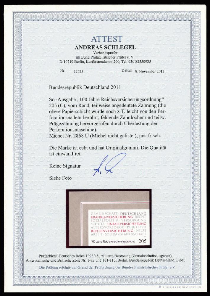 | Zusatzinformationen und Suchstichworte: | 80. HBA Auktion 9. - 12. November 2022 Los 2186 (D) Bundesrepublik Deutschland 2011, 100 Jahre Reichsversicherungsordnung, 205 C., breitrandig ungezähnt, die Perforationsnadeln berührten stellenweise noch das Papier, stanzten es aber nicht durch, tadellos postfrisches Kabinettstück, gepr. Schlegel mit Fotoattest, Mi. 500,-- Ausruf 150,00 EUR |
