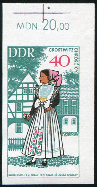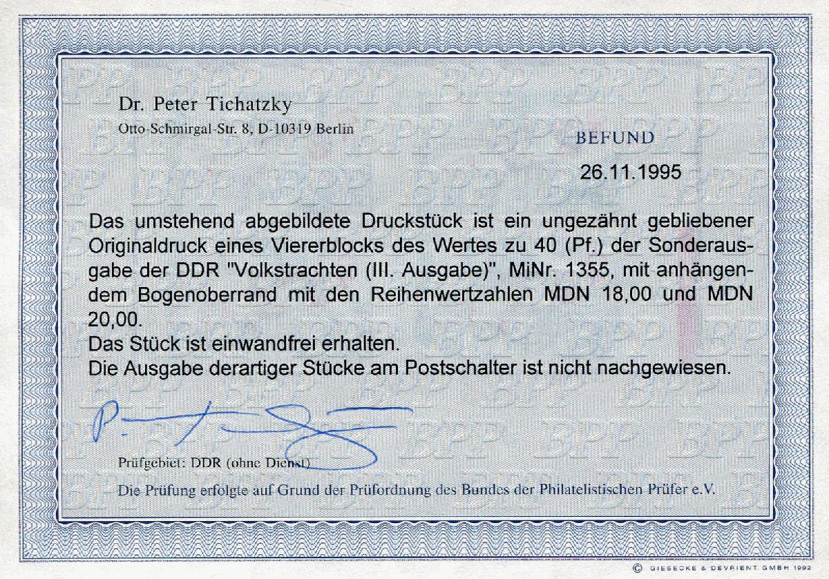 | Zusatzinformationen und Suchstichworte: | Schlegel Online-Shop Los 4020300013 DDR 1968, 40 Pf. Volkstrachten, rechtes oberes Eckrandstück mit Reihenwertzahl oben, ungezähnt. Offizieller Druck zu Ausstellungszwecken für die Deutsche Post der DDR. Geringe Auflage, Befund Dr. Tichatzky BPP Festpreis 50,00 EUR |