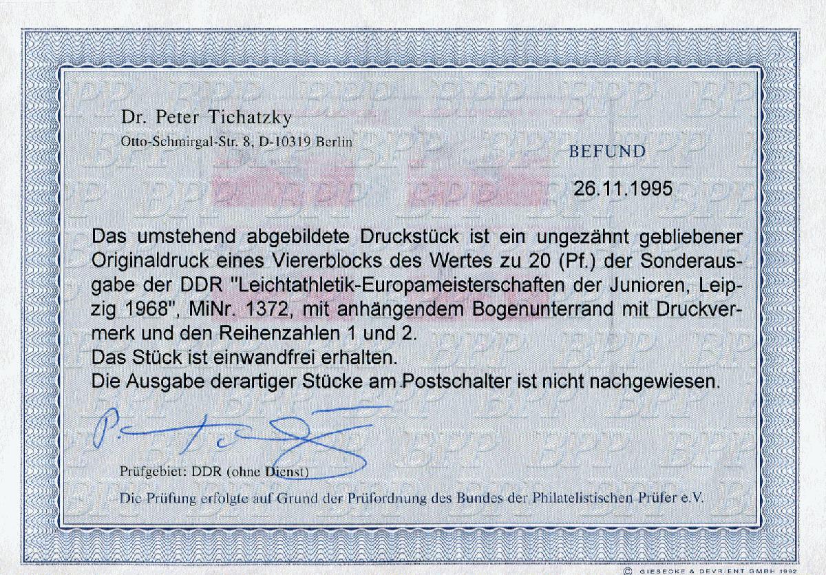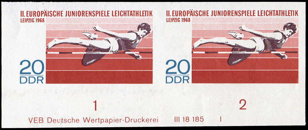 | Zusatzinformationen und Suchstichworte: | Schlegel Online-Shop Los 4020300137 DDR 1968, 20 Pf., Juniorenspiel Leichtathletik, linkes unteres Eckrandpaar mit Druckvermerk, ungezähnt. Offizieller Druck zu Ausstellungszwecken für die Deutsche Post der DDR. Geringe Auflage, Kopiebefund Dr. Tichatzky BPP Festpreis 100,00 EUR |