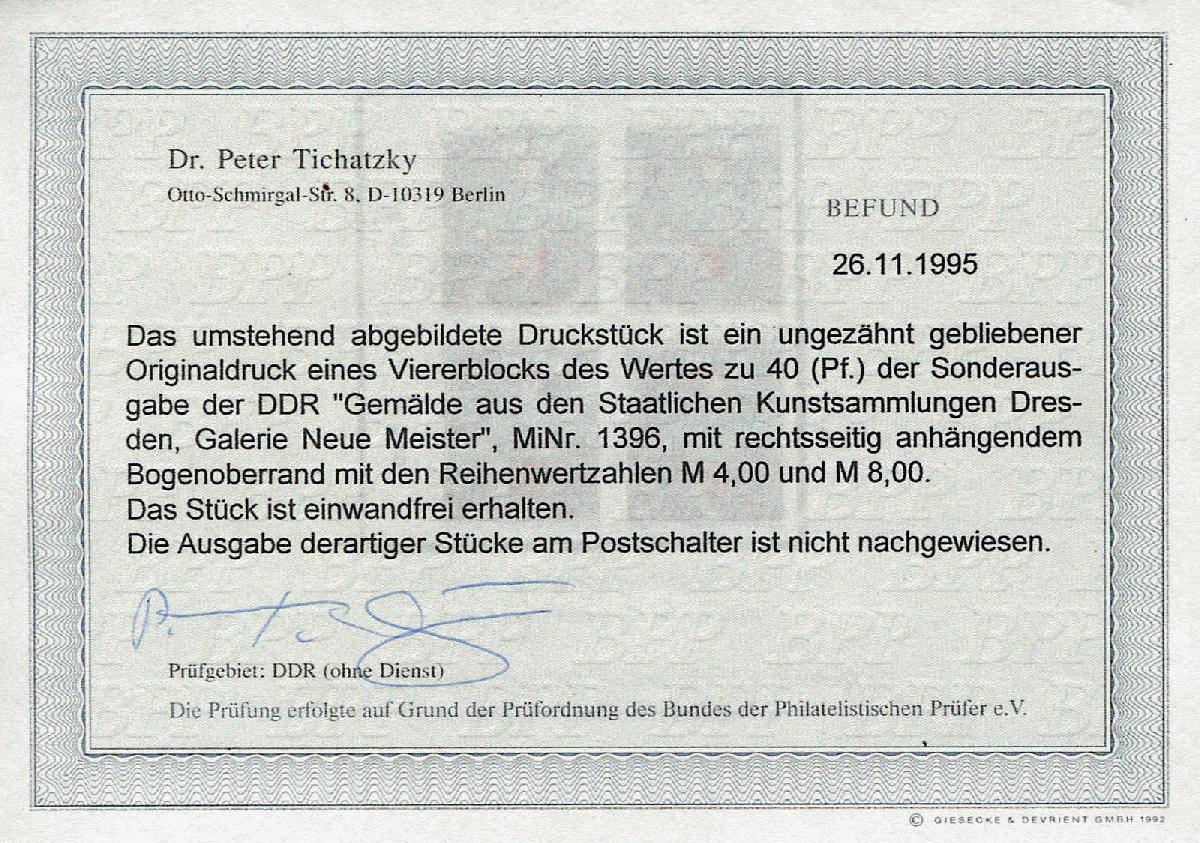 | Zusatzinformationen und Suchstichworte: | Schlegel Online-Shop Los 4020300004 DDR 1968, 40 Pf. Gemälde, ungezähnt. Offizieller Druck zu Ausstellungszwecken für die Deutsche Post der DDR. Geringe Auflage, Kopiebefund Dr. Tichatzky BPP Festpreis 50,00 EUR |