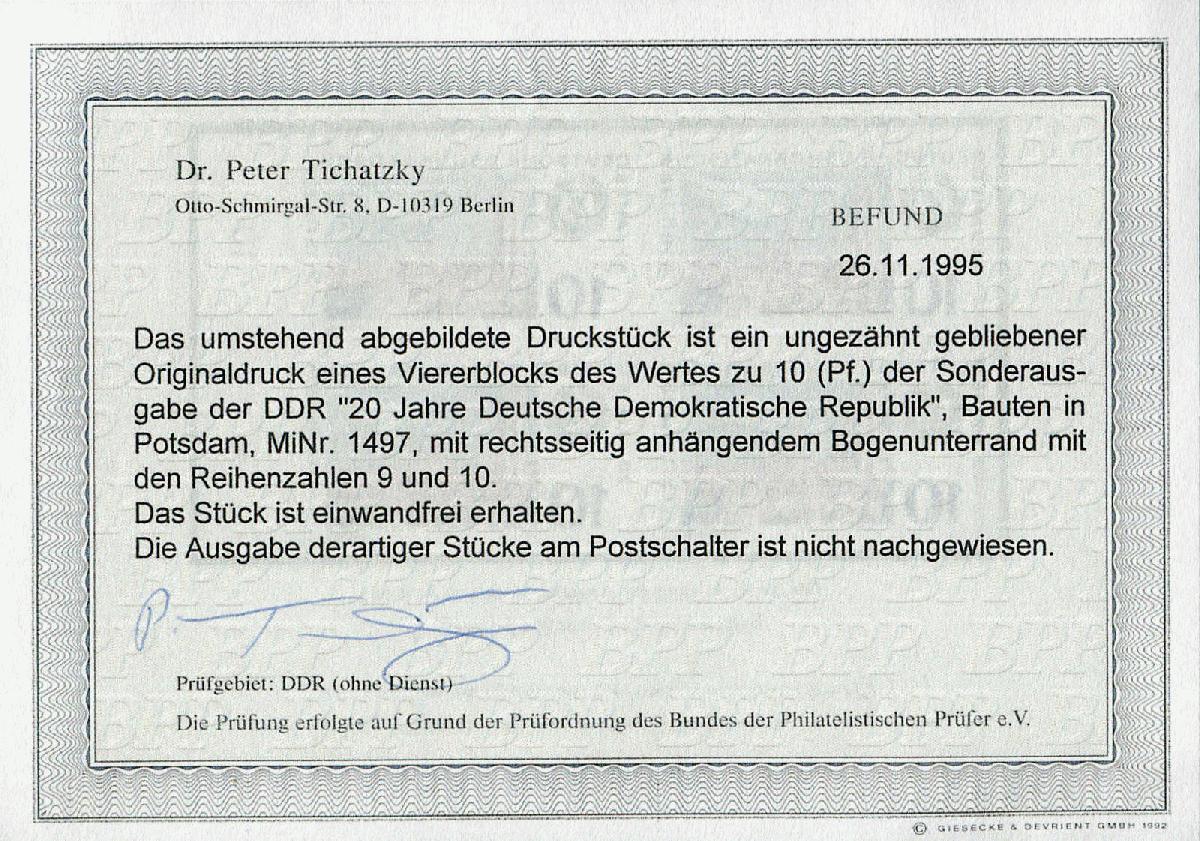 | Zusatzinformationen und Suchstichworte: | Schlegel Online-Shop Los 4020300066 DDR 1969, 10 Pf. 20 Jahre DDR, Potsdam, rechtes Seitenrandstück, ungezähnt. Offizieller Druck zu Ausstellungszwecken für die Deutsche Post der DDR. Geringe Auflage, Kopiebefund Dr. Tichatzky BPP Festpreis 50,00 EUR |