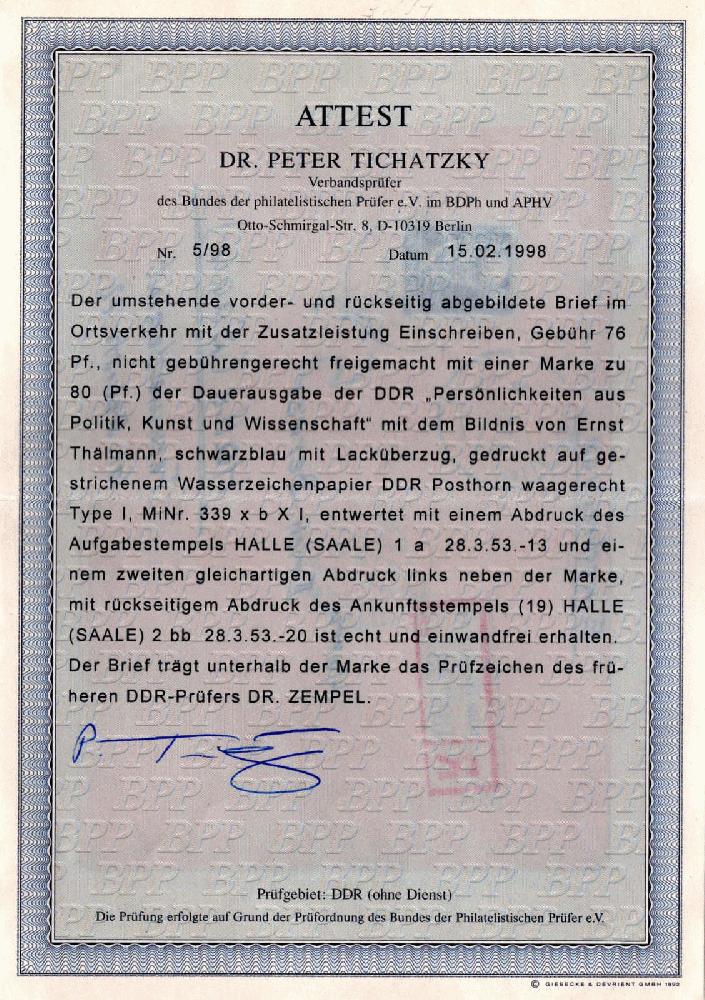 | Zusatzinformationen und Suchstichworte: | 73. Hadersbeck Auktion 26. - 27. Oktober 2022 Los 2920 DDR 80 Pf. Lack, auf mit 4 Pf. überfrankiertem R-Ortsbrief, rücks. Ank.-St., Altattest Tichatzky (02/98) "...überfrankiert, Stempel echt, einwandfrei", KW f.gest. 1600,- Ausruf 280,00 EUR |