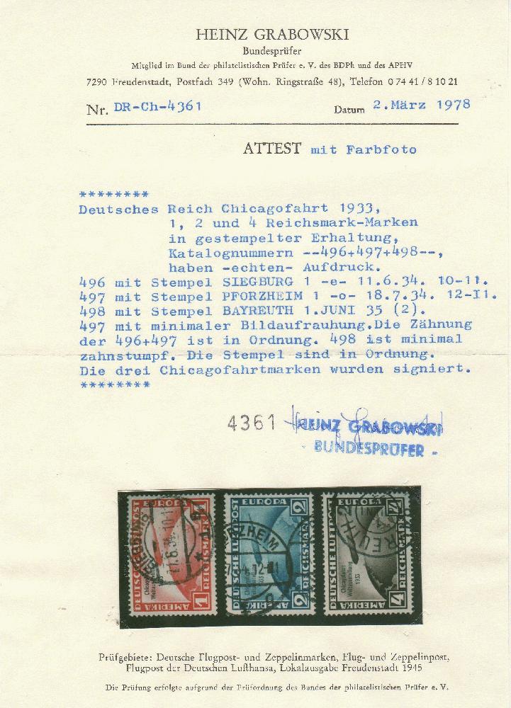 | Zusatzinformationen und Suchstichworte: | Chicagofahrt 1933 echter Aufdruck. Die Stempel sind in Ordnung und die Marken wurden signiert. |