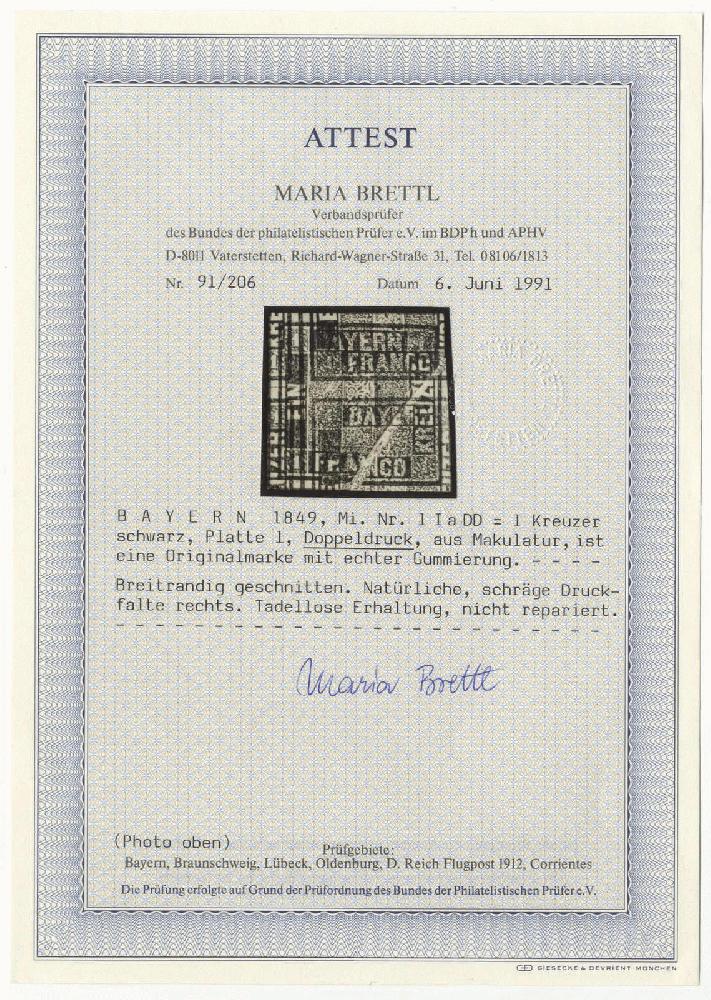 | Zusatzinformationen und Suchstichworte: | 71. Deider Auktion 25. November 2022 Los 1010 Altdeutschland Bayern 1 Kreuzer schwarz, Platte 1, Doppeldruck aus Makulatur, feinst breitrandig und farbfrisch mit interessanter schräger, natürlicher Druckfalte, Fotoattest Brettl BPP Ausruf 800,00 EUR |