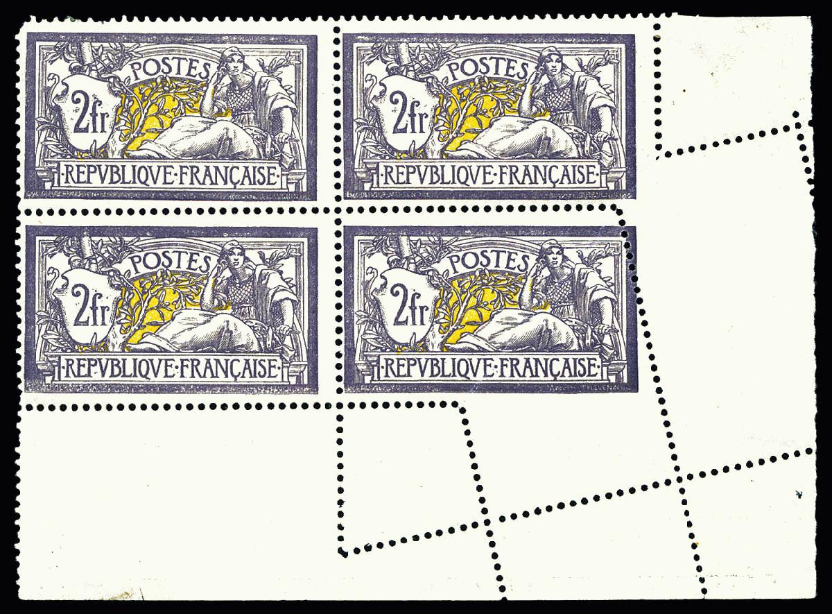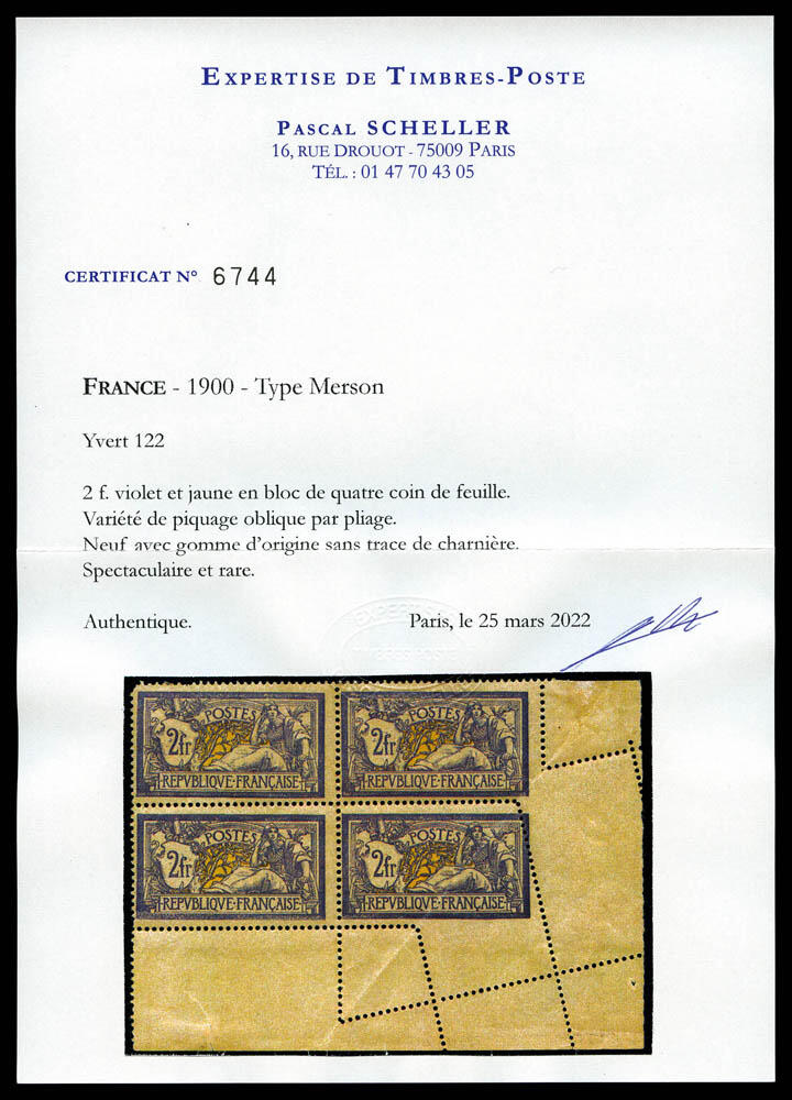 | Zusatzinformationen und Suchstichworte: | La Postale Philatélie 39. Auktion 7. Oktober 2022 Los 2185 Frankreich N°122, 2F violet et jaune: Spectaculaire variété de piquage oblique par pliage sur bloc de quatre coin de feuille (ex vente Hermione 2018, lot 347). PROBABLEMENT UNIQUE. SUPERBE. R.R.R. (signé Calves/certificats) Qualité: ** Ausruf 9.500,00 EUR |