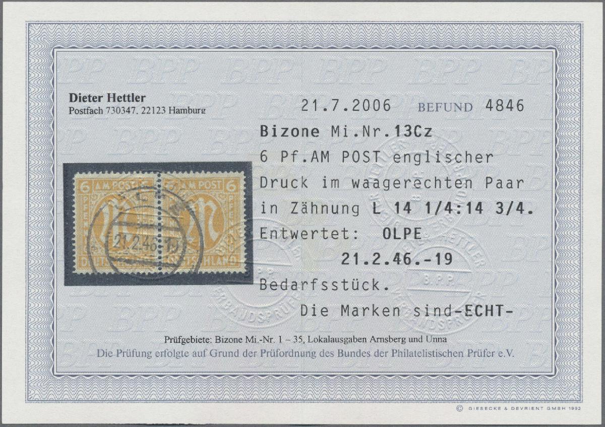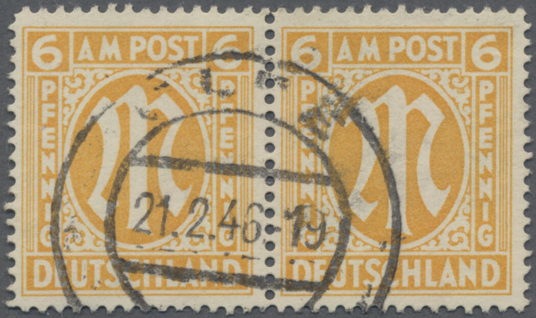 | Zusatzinformationen und Suchstichworte: | Christoph Gärtner 54. Auktion 19. Oktober 2022 Los 6294 D Bizone 1945, AM-Post Britischer Druck, 6 Pfg. gelborange, z-Papier, gez. 14¼:14¾, waagerechtes Paar, sauber gestempelt "OLPE 21.2.46". Fotobefund Hettler BPP. Mi. 1.200,- € Ausruf 200,00 EUR |