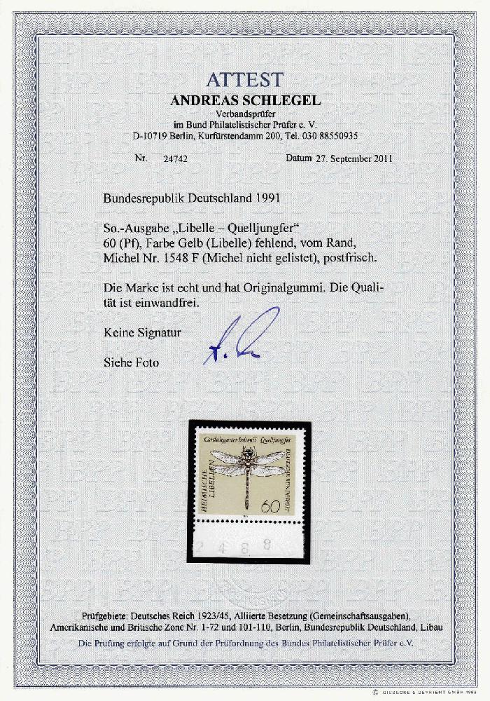 | Zusatzinformationen und Suchstichworte: | 148., 149. und 150. Teutoburger Münzauktion 12. - 16. September 2022 Los 532 Bundesrepublik Deutschland 60 Pf. Libelle (Quelljungfer) 1991, postfrische Erhaltung, die Farbe Gelb (Flügel, Körper)) fehlend. Fotoattest Schlegel BPP. Michel ohne Preis. Zuschlag 150,00 EUR |
