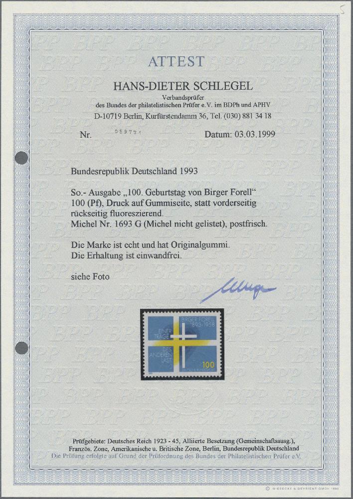 | Zusatzinformationen und Suchstichworte: | Christoph Gärtner 54. Auktion 19. Oktober 2022 Los 6444 D Bundesrepublik Deutschland 1993, 100 Pf., 100. Geburtstag von Birger Forell, Abart "DRUCK AUF GUMMISEITE", tadellos postfrisch. Fotoattest Schlegel BPP: "Die Marke ist echt und hat Originalgummi. Die Erhaltung ist einwandfrei.". Mi. 500,- EUR Ausruf 100,00 EUR |