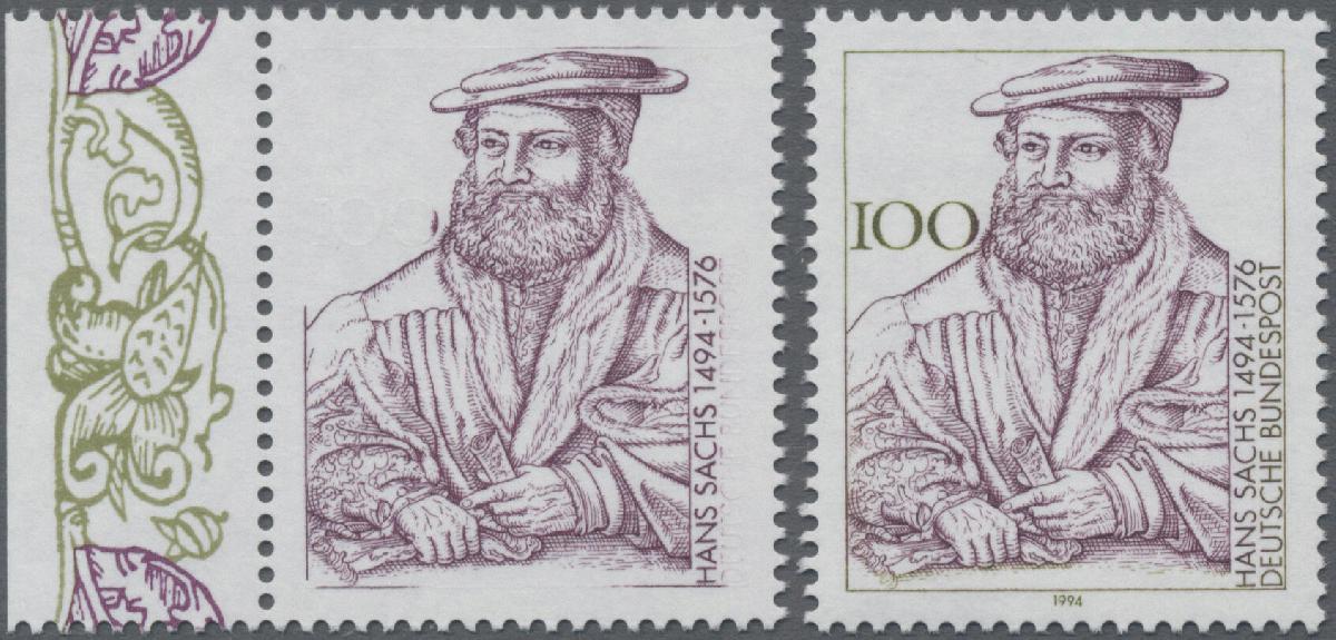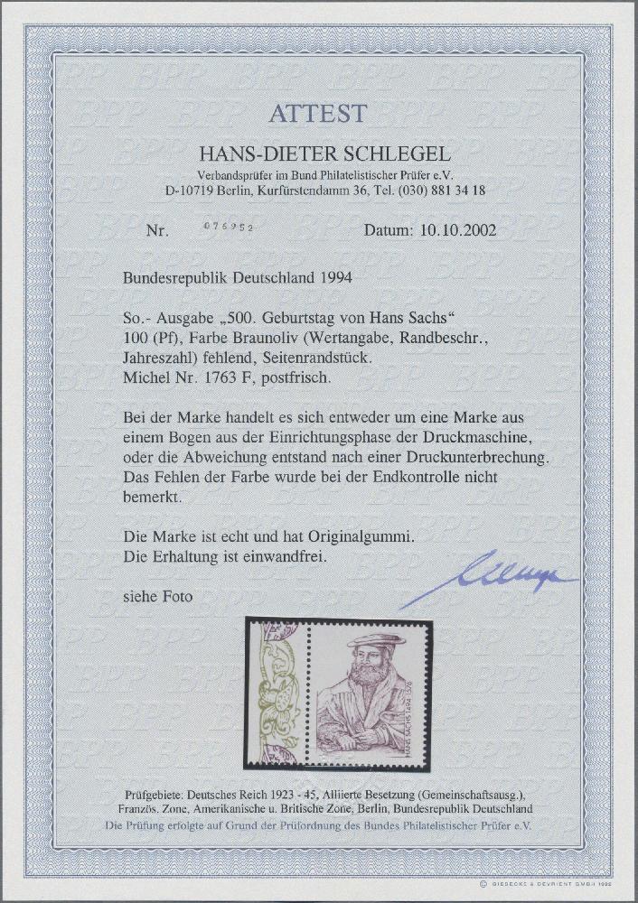 | Zusatzinformationen und Suchstichworte: | Christoph Gärtner 54. Auktion 19. Oktober 2022 Los 6445 D Bundesrepublik Deutschland 1994, 100 Pf., 500. Geburtstag von Hans Sachs, Abart "FARBE BRAUNOLIV FEHLEND" vom Bogenrand, tadellos postfrisch, dazu Vergleichsstück. Fotoattest Schlegel BPP: "Die Marke ist echt und hat Originalgummi. Die Erhaltung ist einwandfrei." |