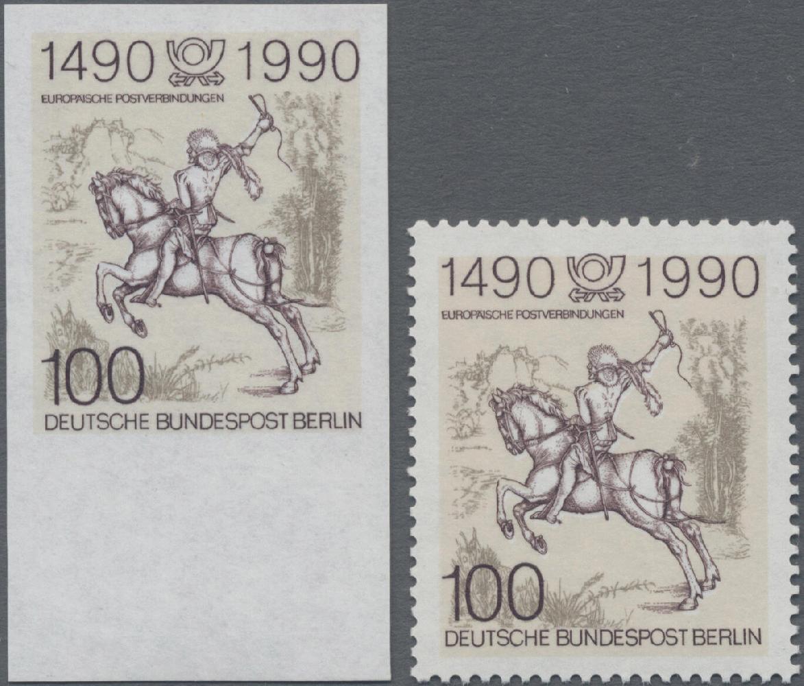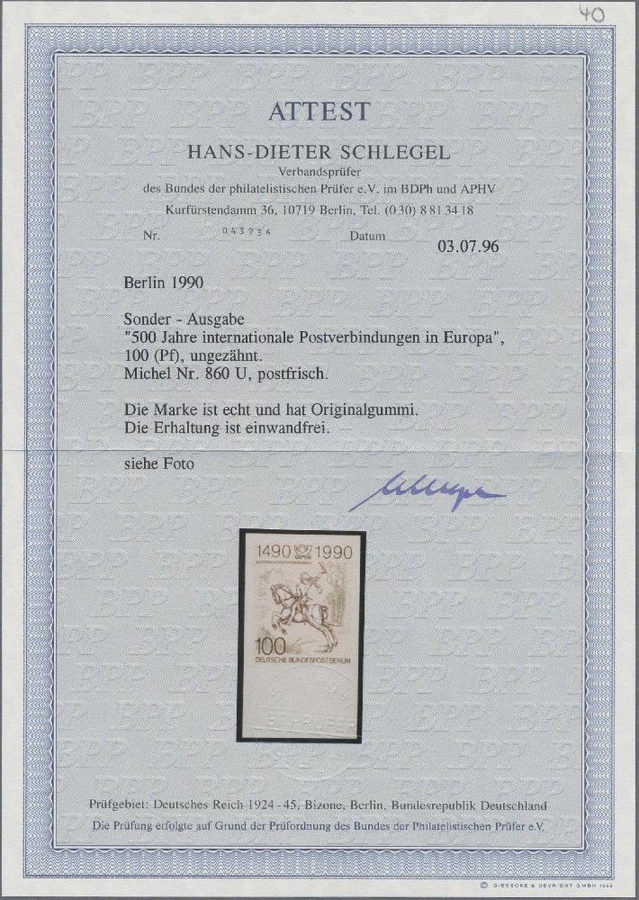 | Zusatzinformationen und Suchstichworte: | Christoph Gärtner 54. Auktion 19. Oktober 2022 Los 6185 D+ Berlin 1990, 100 Pf., 500 Jahre internationale Postverbindungen in Europa, UNGEZÄHNTES UNTERRANDSTÜCK, tadellos postfrisch, dazu Vergleichsstück. Fotoattest Schlegel BPP: "Die Marke ist echt und hat Originalgummi. Die Erhaltung ist einwandfrei.". Eine seltene Abart. Mi. 2.500,- EUR Zuschlag 440,00 EUR |