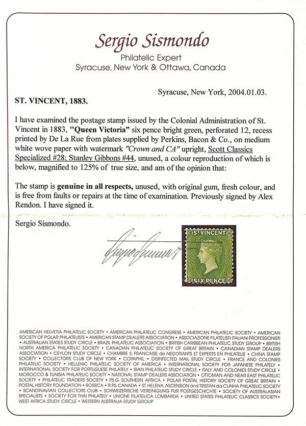 | Zusatzinformationen und Suchstichworte: | Kelleher Auktion 2002. - The Kelleher Club Sale 18. - 20. Oktober 2022 Los 1150 St. Vincent 1880, Königin Victoria, 6d hellgrün, gezähnt 11-12½ (Scott 28), kleines Stern Wasserzeichen, Originalgummi gefalzt, Pracht, signiert Sismondo, mit 2004 Sismondo Attest. Scott $550. Ausruf 100,00 USD |