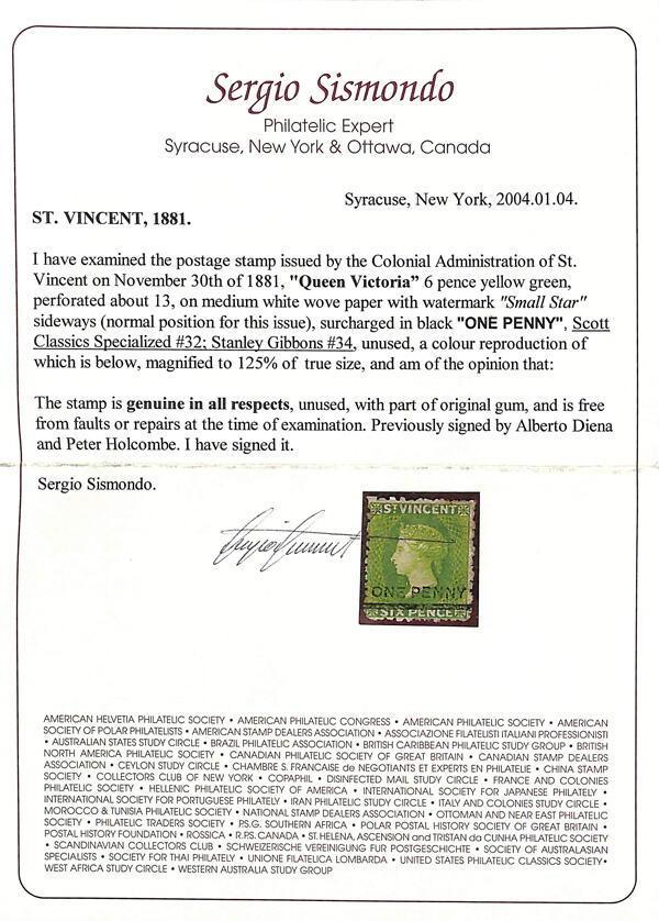 | Zusatzinformationen und Suchstichworte: | Kelleher Auktion 2002. - The Kelleher Club Sale 18. - 20. Oktober 2022 Los 1151 St. Vincent 1881, Ortszuschläge, 1d auf 6d hellgrün (Scott 32), kleines Stern Wasserzeichen, Teiloriginalgummi Pracht, signiert Sismondo, mit 2004 Sismondo Attest. SG 34. Scott $500. Ausruf 130,00 USD |
