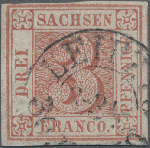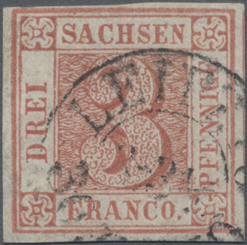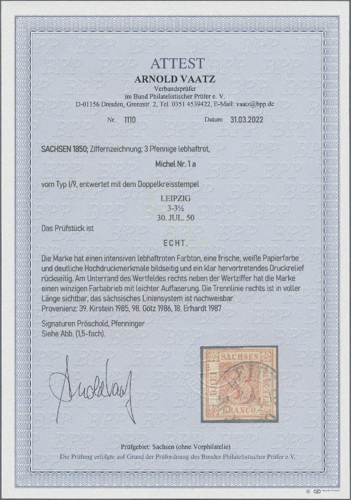 | Zusatzinformationen und Suchstichworte: | Christoph Gärtner 54. Auktion 18. - 19. Oktober 2022 Los 4681 D Altdeutschland Sachsen 1850, 3 Pfg. lebhaftrot, Type I/9., entwertet mit Doppelkreisstempel "LEIPZIG 3-3 1/2 30.JUL.50" neues Fotoattest Vaatz BPP "Das Prüfstück ist echt. Die Marke hat einen intensiven lebhaftroten Farbton, eine frische, weiße Papierfarbe und deutliche Hochdruckmerkmale bildseitig und ein klar hervortretendes Druckrelief rückseitig. Am Unterrand des Wertfeldes rechts neben der Wertziffer hat die Marke einen winzigen Farbabrieb mit leichter Auffaserung. Die Trennlinie rechts ist in voller Länge sichtbar, das sächsische Liniensystem ist nachweisbar. Provenienz: 39.Kirstein 1985, 98. Götz 1986, 18. Erhardt 1987. Signaturen Pröschold und Pfenninger Zuschlag 3.400,00 EUR |