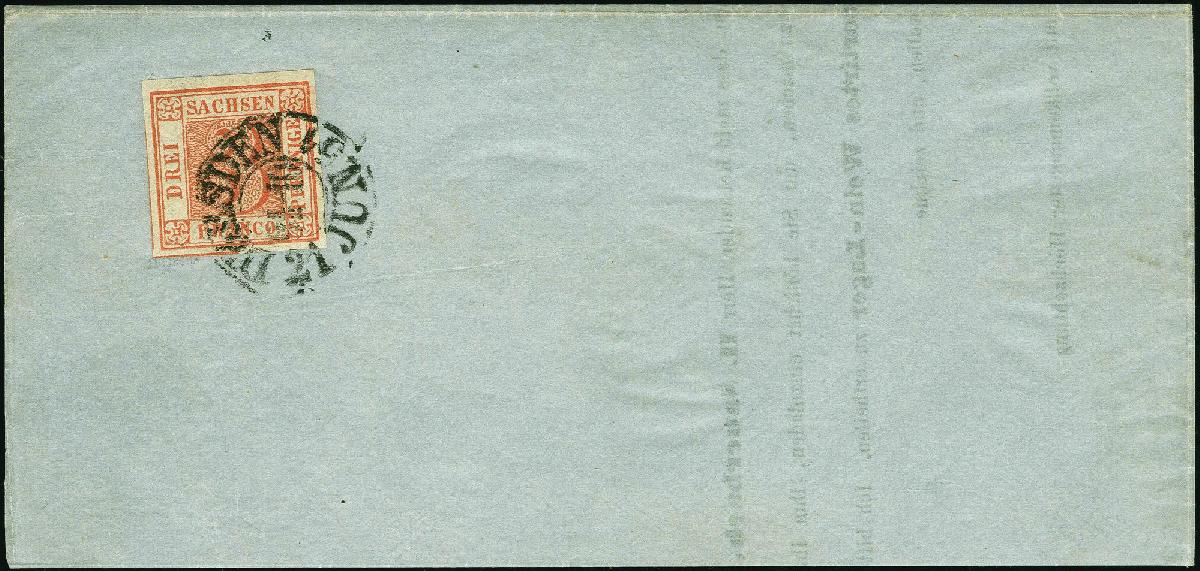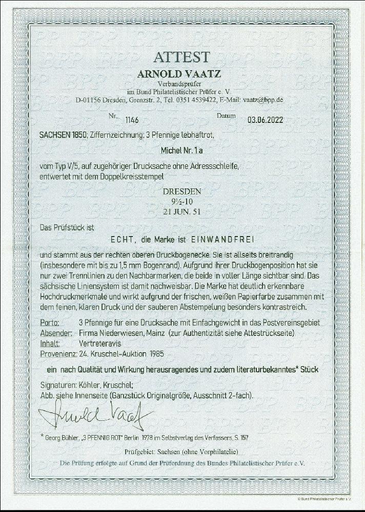 | Zusatzinformationen und Suchstichworte: | Heinrich Köhler 379. Auktion 19. - 24. September 2022 Los 5267 Altdeutschland Sachsen 3Pfg. lebhaftrot, Platte V, Type 5, sehr schöne frische Farbe und allseits breitrandig, aus der rechten oberen Bogenecke stammend, mit Trennlinien links und unten und bis zu 1,5 mm Bogenrand, mit klar aufgesetztem DKr. "DRESDEN 21 JUN. 51" auf vollständiger Drucksache der Weinhandlung Niedererwiesen in Mainz (ohne Adressschleife). Ein besonders schönes Stück in völlig tadelloser und ursprüngliche Erhaltung. Signiert Kruschel und Fotoatteste Pröschold BPP (1985) und Vaatz BPP (2022) Zuschlag 14.500,00 EUR |