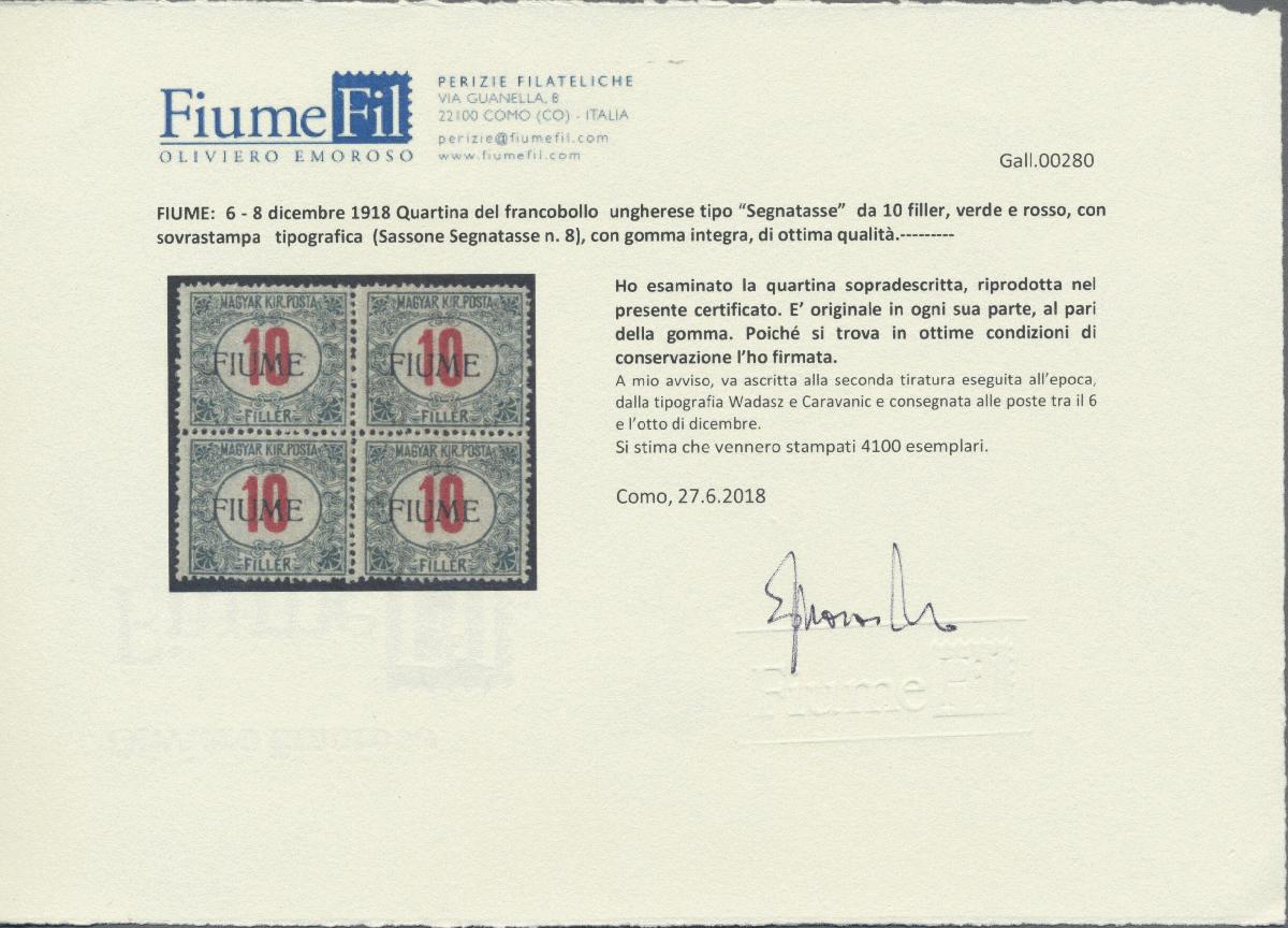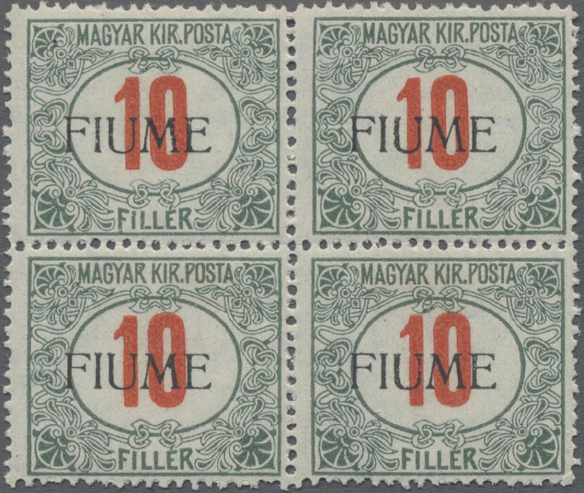 | Zusatzinformationen und Suchstichworte: | Christoph Gärtner 54. Auktion 18. - 19. Oktober 2022 Los 3762 D Fiume 1918,10 Füller, ungarischen Portomarke Maschinenüberdruck "FIUME", postfrisch Viererblock, Attest Emoroso. Ausruf 180,00 EUR |