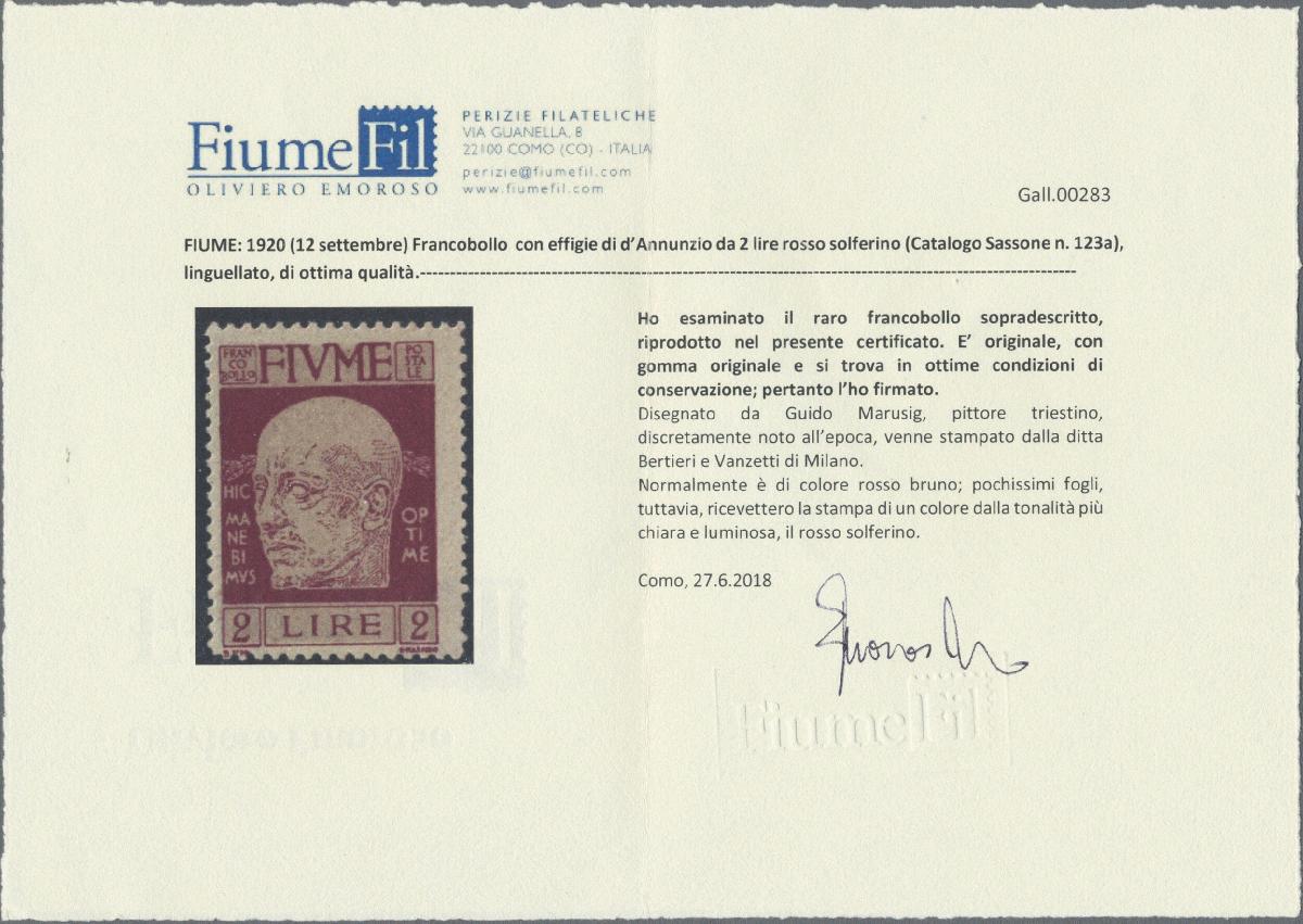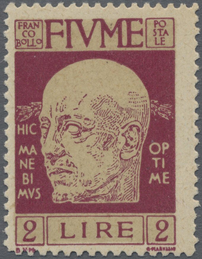 | Zusatzinformationen und Suchstichworte: | Christoph Gärtner 54. Auktion 18. - 19. Oktober 2022 Los 3760 D Fiume 1920, 2 L. "dAnnunzio" Solferino rot (statt lilabraune), ungebraucht, Attest Emoroso. Ausruf 180,00 EUR |