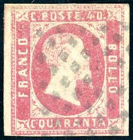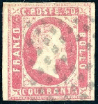 | Zusatzinformationen und Suchstichworte: | 26. Ferrario Auktion 1. Oktober 2022 Los 568 Italien Staaten Sardinien 1851 - 40 cent. rosa carminio vivo (3b), usato, perfetto. Molto fresco, ampi margini. Emilio Diena, Ferrario, cert. Fiecchi. Cat. € 12000 Ausruf 1.000,00 EUR |