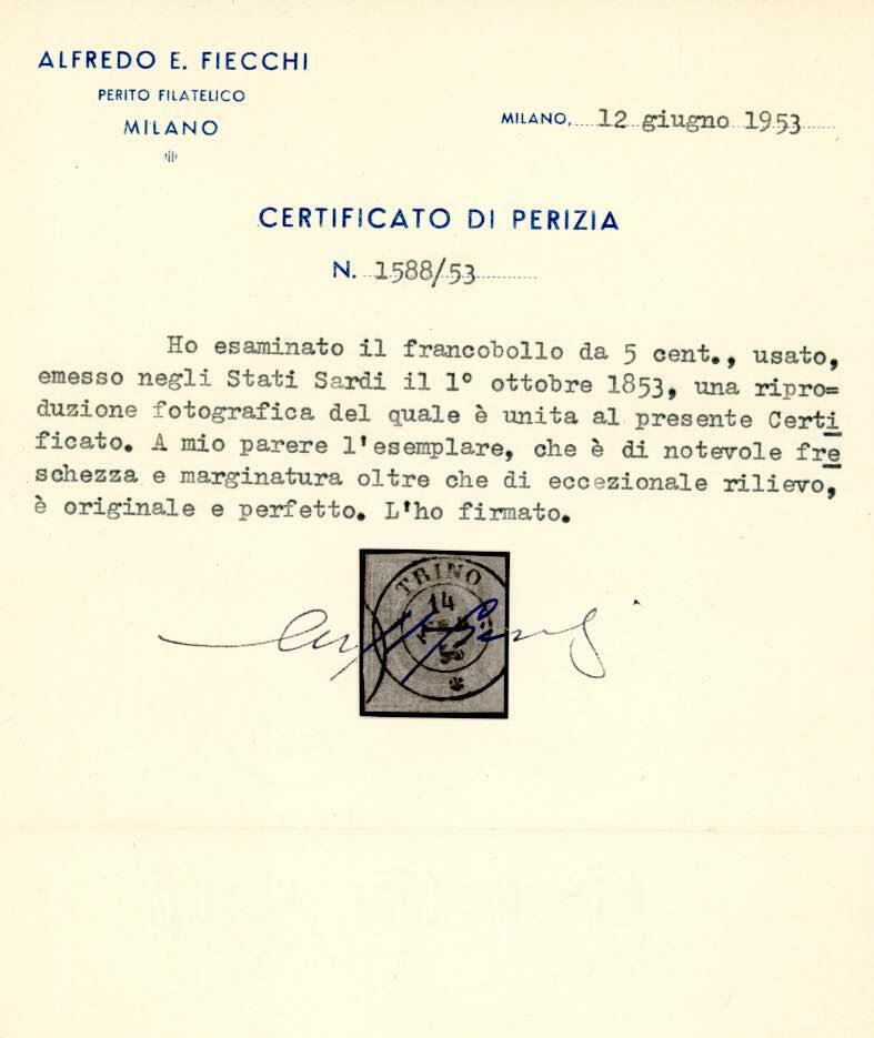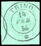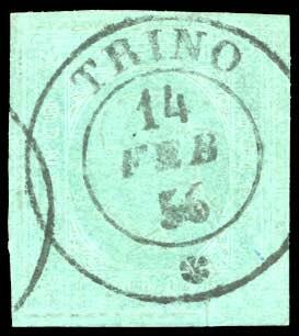 | Zusatzinformationen und Suchstichworte: | 26. Ferrario Auktion 1. Oktober 2022 Los 573 Italien Staaten Sardinien 1853 - 5 cent. verde (4), perfetto e ben marginato, usato a Trino 14/2/1856. Molto bello! Cert. Fiecchi. Cat. € 2500 Zuschlag 300,00 EUR |