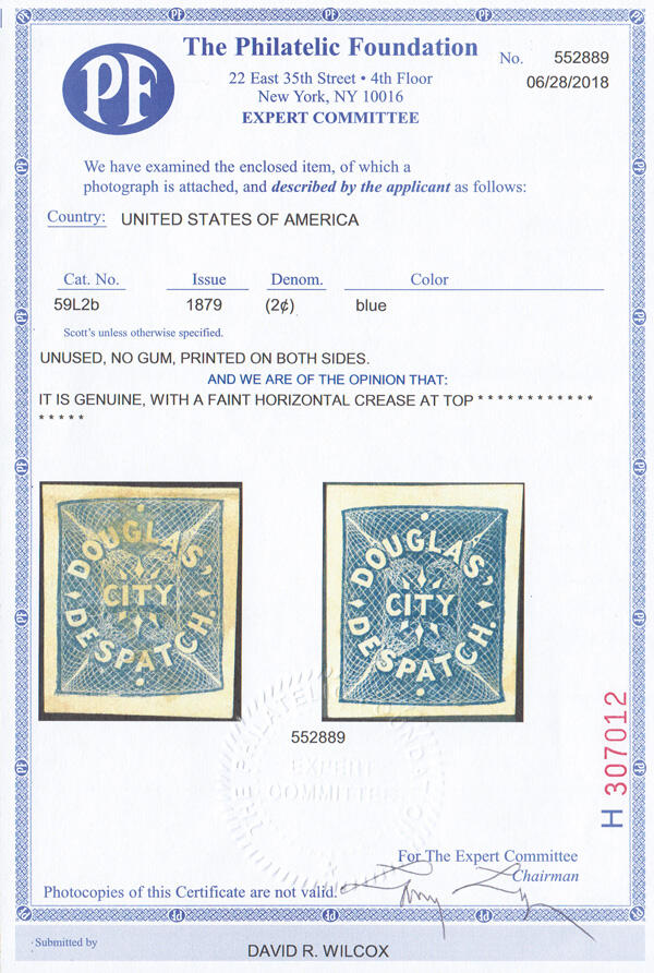| Zusatzinformationen und Suchstichworte: | Kelleher Auktion 2002. - The Kelleher Club Sale 18. - 20. Oktober 2022 Los 1907 USA Carriermarken Lokalausgaben Douglas Stadt Abfertigung, 1879 (2¢) blau, auf beide Seiten gedruckt (Scott 59L2b), ungebraucht ohne Gummi, gleichmäßig breite Ränder, Pracht. Gelistet aber ohne Preis, mit ein 2018 P. F. Attest Ausruf 80,00 USD |