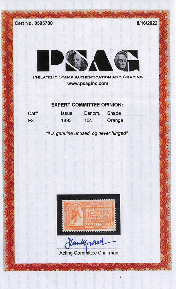 | Zusatzinformationen und Suchstichworte: | Kelleher Auktion 2002. - The Kelleher Club Sale 18. - 20. Oktober 2022 Los 1698 USA Eilboten, 1893,10¢ orange (Scott E3), Originalgummi postfrisch, ein ansprechendem Briefmarke mit leuchtend, farbfrisch auf makellosem Papier, feinst bis Pracht, mit 2022 P. S. A. G. Attest. Scott $650. Ausruf 180,00 USD |