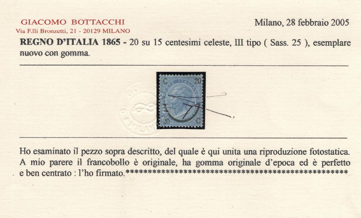 | Zusatzinformationen und Suchstichworte: | 6. Pilatusmail-Auktion 22. - 24. September 2022 Los 390 Italien 1865, 20c/15c Type III mattblau, Attest Bottacchi, 550.- Zuschlag 100,00 CHF |