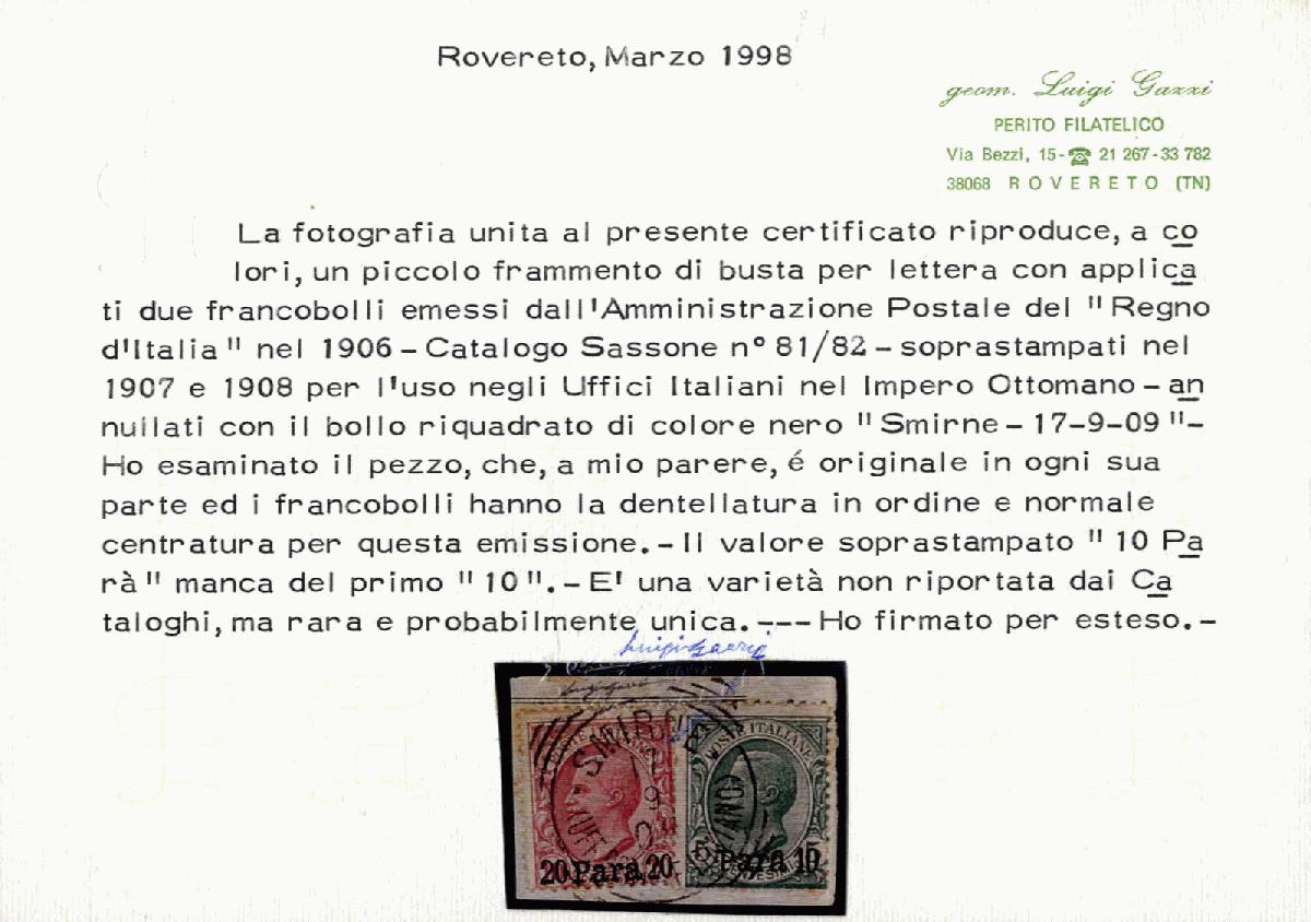 | Zusatzinformationen und Suchstichworte: | 75. Viennafil Live-Auktion 29. November - 2. Dezember 2022 Los 783 Italienische Post in Albanien 1908, piccolo frammento di lettera affrancato con 10 Para su 5 c. verde e 20 Para su 10 c. rosa, annullo "SMIRNE (UFFICIO POSTALE ITALIANO), 17/9/08" (i due francobolli erano validi in tutti gli uffici dell'Impero Ottomano dal 1.6.1908), il 10 Para su 5 c. manca del primo "10", probabilmente dovuto al fatto, che il francobollo era piegato all'angolo inferiore sinistro all'atto della sovraimpressione (la piega è ben visibile), varietà non riportata nel cat. Sassone, molto rara, cert. L. Gazzi (Sass. 10 var., 11) Ausruf 400,00 EUR |