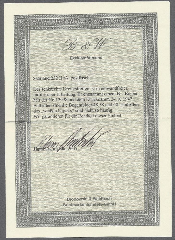 | Zusatzinformationen und Suchstichworte: | Auction Galleries Hamburg 25. Auktion 2. - 3. September 2022 Los 1302 Saarland 1947, 20 Pfg "Saar II", Neuauflage, Abart "ohne Aufdruck 5Fr.", senkrechter Dreierstreifen, tadellos postfrisch, Fotoattest Brodowski: "echt und einwandfrei", Mi. 150,- Ausruf 50,00 EUR |