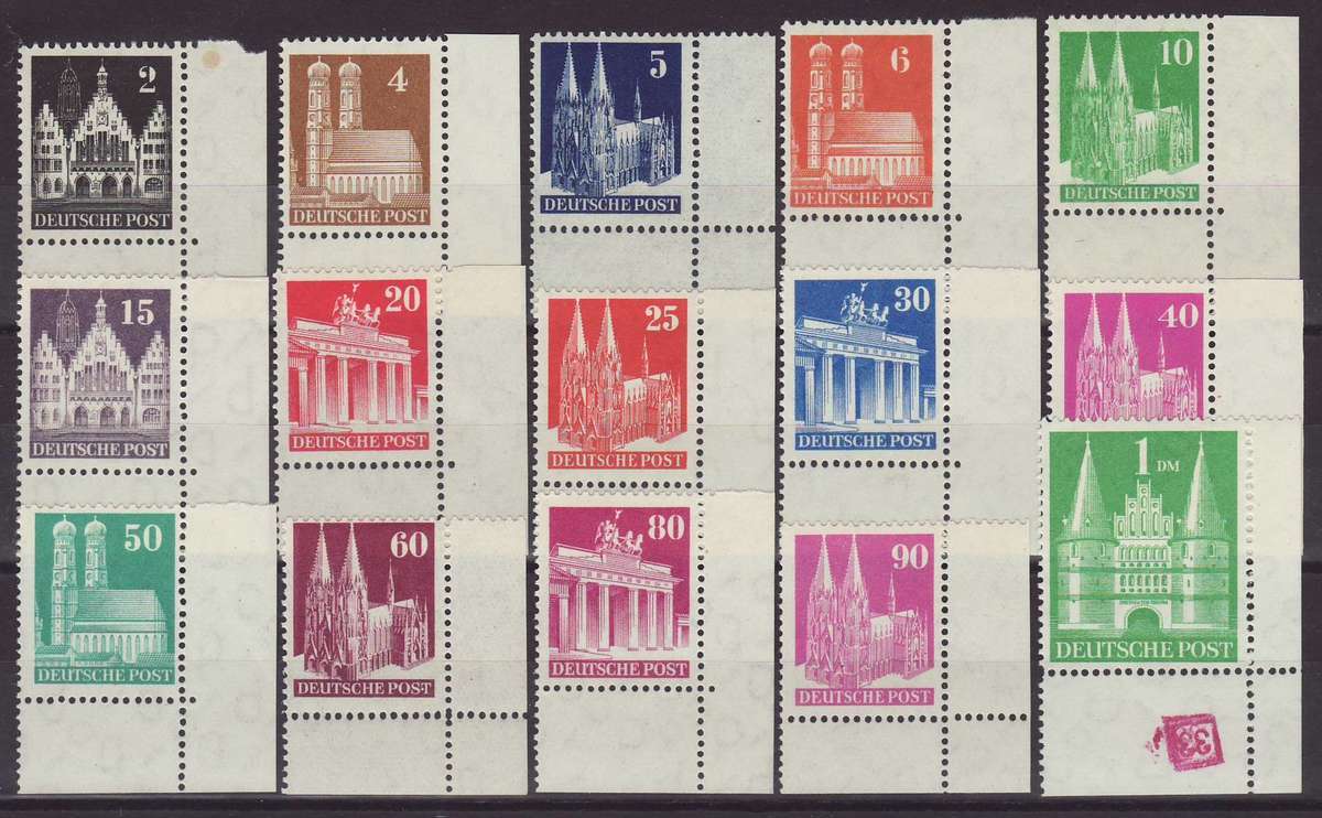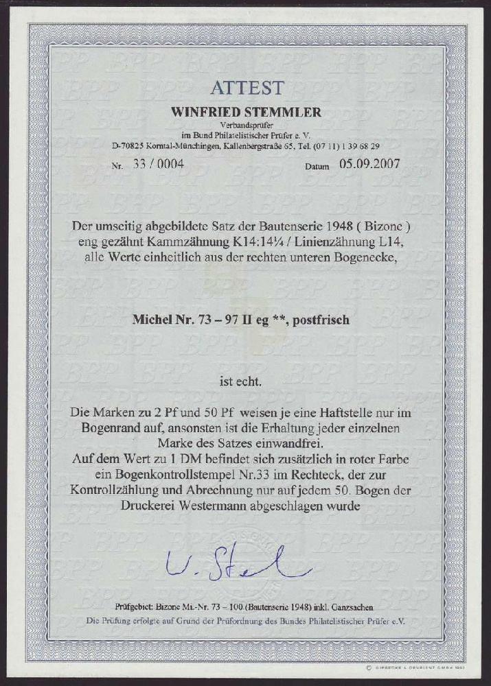 | Zusatzinformationen und Suchstichworte: | Christian E. Geigle Briefmarkenfachhandel Los 0003438642 Bizone 1948, Bauten eng gezähnt, 15 W. kpl., postfrischer Luxussatz einheitlich aus der rechten unteren Bogenecke, auch dort tadellos postfrisch, ungefaltet und unbeschriftet, lediglich die 2 und 50 Pf. haben jeweils eine winzige Haftstelle im Bogenrand, die die Marke aber nicht berührt, auf dem Wert zu 1 DM befindet sich zusätzlich in roter Farbe ein Bogenkontrollstempel "33" im Rechteck, der zur Kontrollzählung und Abrechnung nur auf jedem 50. Bogen der Druckerei Westermann abgeschlagen wurde, Ausnahmequalität und in dieser Form ein ungewöhnlicher Satz, unsigniert mit FA Stemmler "die Marken zu 2 Pf. und 50 Pf. weisen je eine Haftstelle nur im Bogenrand auf, ansonsten einwandfrei" Festpreis 790,00 EUR |