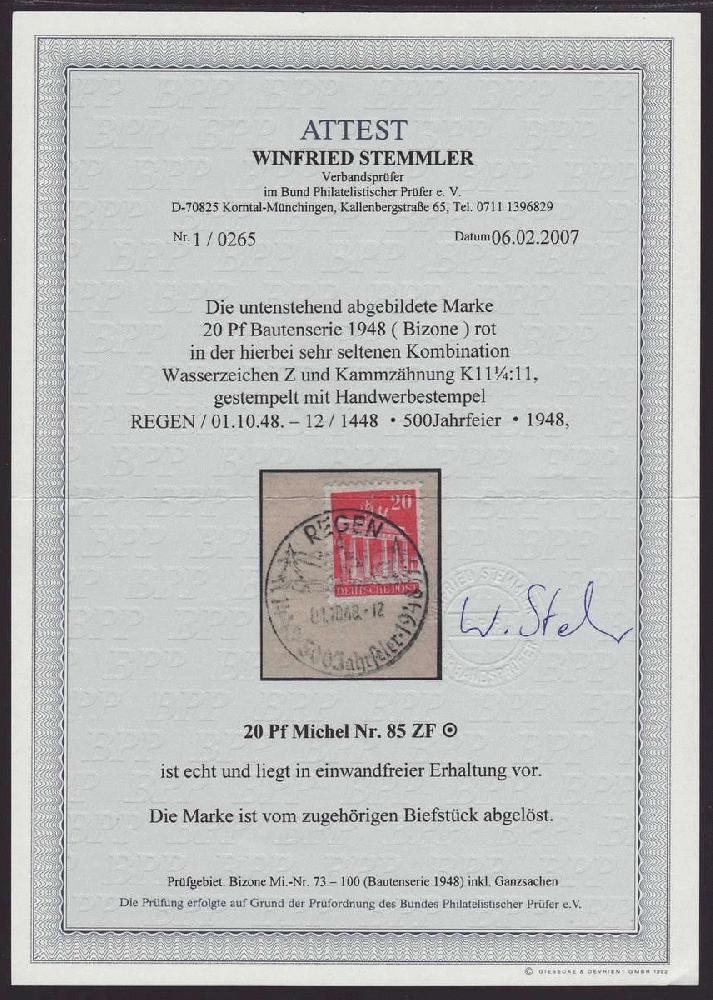 | Zusatzinformationen und Suchstichworte: | Christian E. Geigle Briefmarkenfachhandel Los 0003334742 Bizone 1948, Bauten, 20 Pf. dunkelrosarot, Wasserzeichen Z, Zähnung F, Luxusstück dieser seltenen Marke mit klarem SSt. "REGEN 01.10.48-12", von hellem Briefstück gelöst, FA Stemmler "einwandfrei" Festpreis 690,00 EUR |