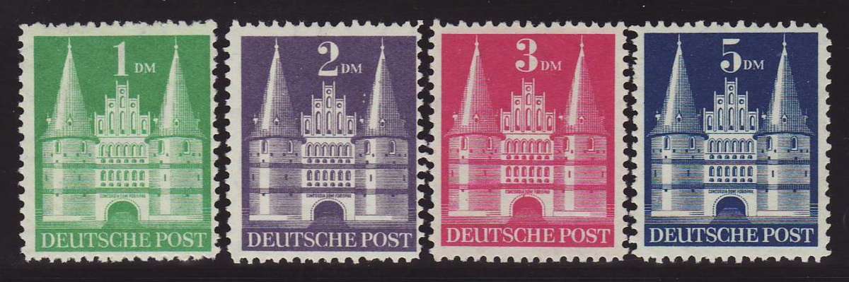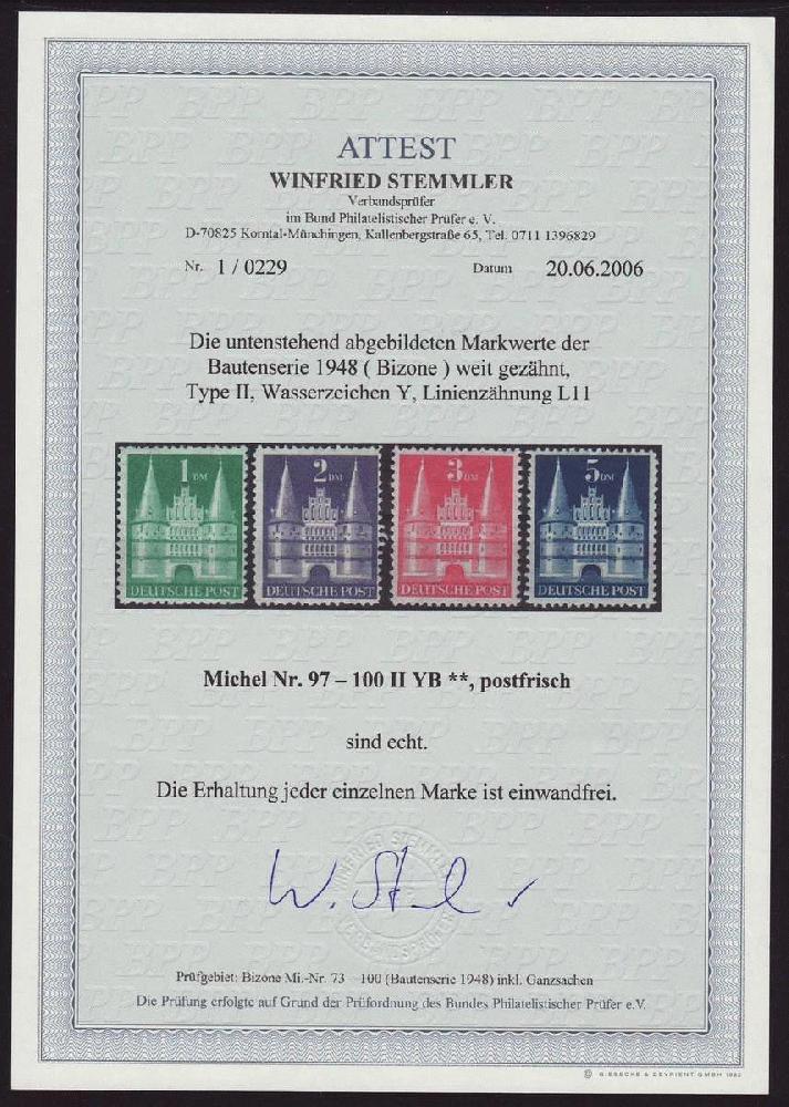 | Zusatzinformationen und Suchstichworte: | Christian E. Geigle Briefmarkenfachhandel Los 0003230564 Bizone 1948, Bauten Markwerte, Type II (sog. "hohe Treppe"), 4 W. kpl., Wasserzeichen Y, Zähnung B, postfrischer Luxussatz, unsigniert mit FA Stemmler "einwandfrei" Festpreis 295,00 EUR |