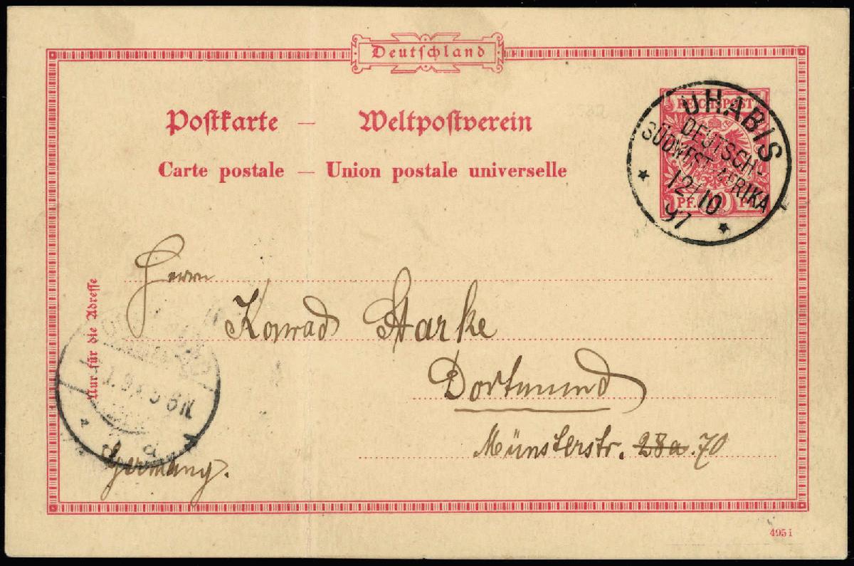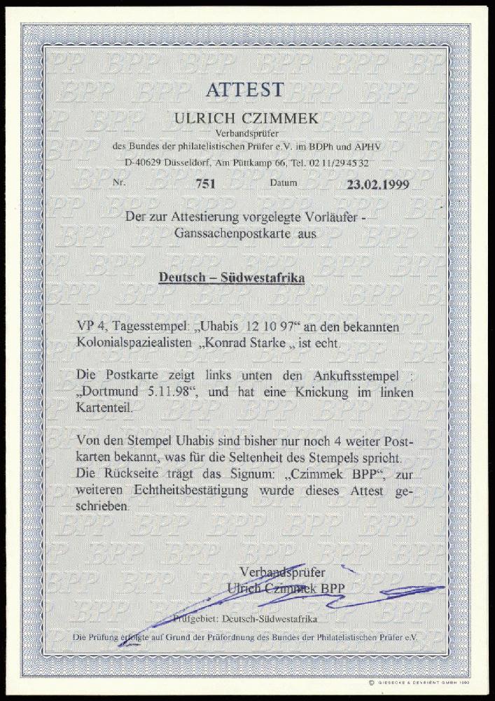 | Zusatzinformationen und Suchstichworte: | 80. HBA Auktion 9. - 12. November 2022 Los 1420 (D) Deutsche Kolonien Südwestafrika, Vorläufer 1897, Krone/Adler, Ganzsachen-Karte, 10 Pfg., mit klarem Stempel "UHABIS DSWA 12/10 97", scheinbar bedarfsgebraucht nach Dortmund mit Ankunftsstempel, der Stempel mit dem Datum 12.10.1897 ist eine Gefälligkeitsentwertung, die aber vergleichsweise selten ist, die Karte zeigt eine senkrechte Faltspur, sonst saubere Prachterhaltung, gepr. Czimmek mit Fotoattest Ausruf 200,00 EUR |