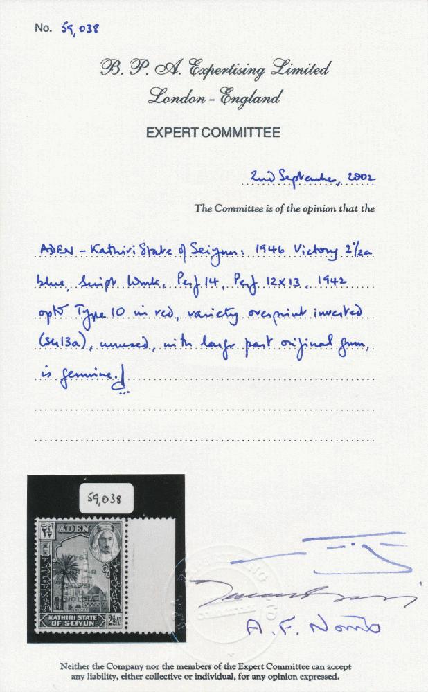 | Zusatzinformationen und Suchstichworte: | Doreen Royan & Associates Shop - Online Los 750838 (D) Aden Aden/Seiyun 1946 King George VI Victory 2½a. blue. Variety, ‘Overprint inverted’. Right marginal example. Superb mint condition. British Philatelic Association Certificate No. 59,038 (2002). VERY RARE Festpreis 1.000,00 GBP |