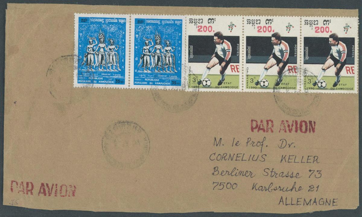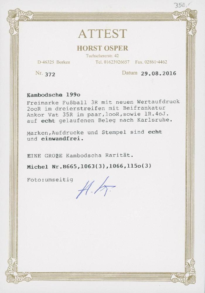| Zusatzinformationen und Suchstichworte: | Ulrich Felzmann 34. e@uction 5. - 9. September 2022 Los 12021 Kambodscha 1990, Soccer/Football provisional 200 R on 3 R as strip of 3 with additional franking on commercial airmail cover sent from PNOM PENH to Karlsruhe in Germany, signed + photo certificate Osper "... great rarity" Ausruf 350,00 EUR |