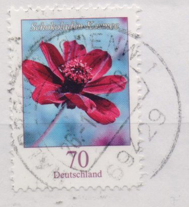 | Zusatzinformationen und Suchstichworte: | Schokoladen-Kosmee auf Briefstück, Farbe Gelb fehlend |