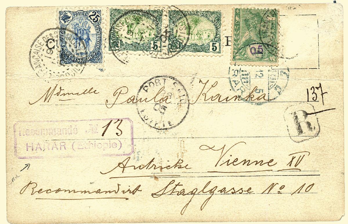 | Zusatzinformationen und Suchstichworte: | Lugdunum 122. Auktion 3. Oktober 2022 Los 1975 Äthiopien 1905 Äthiopien 05 auf 1/4g (selten) Stempel HARAR und Somaliaküste 5c (x 2) und 25c Stempel DJIBOUTI auf Einschreibekarte (selten Foto) nach Österreich. Selten Einschreiben Rechteckstempel HARAR (ETHIOPIE) in violett. Vermutlich Äthiopien 20c fehlend. J. F BRUN Attest. Ex KAUPPINEN Sammlung. Pracht Ausruf 120,00 EUR |