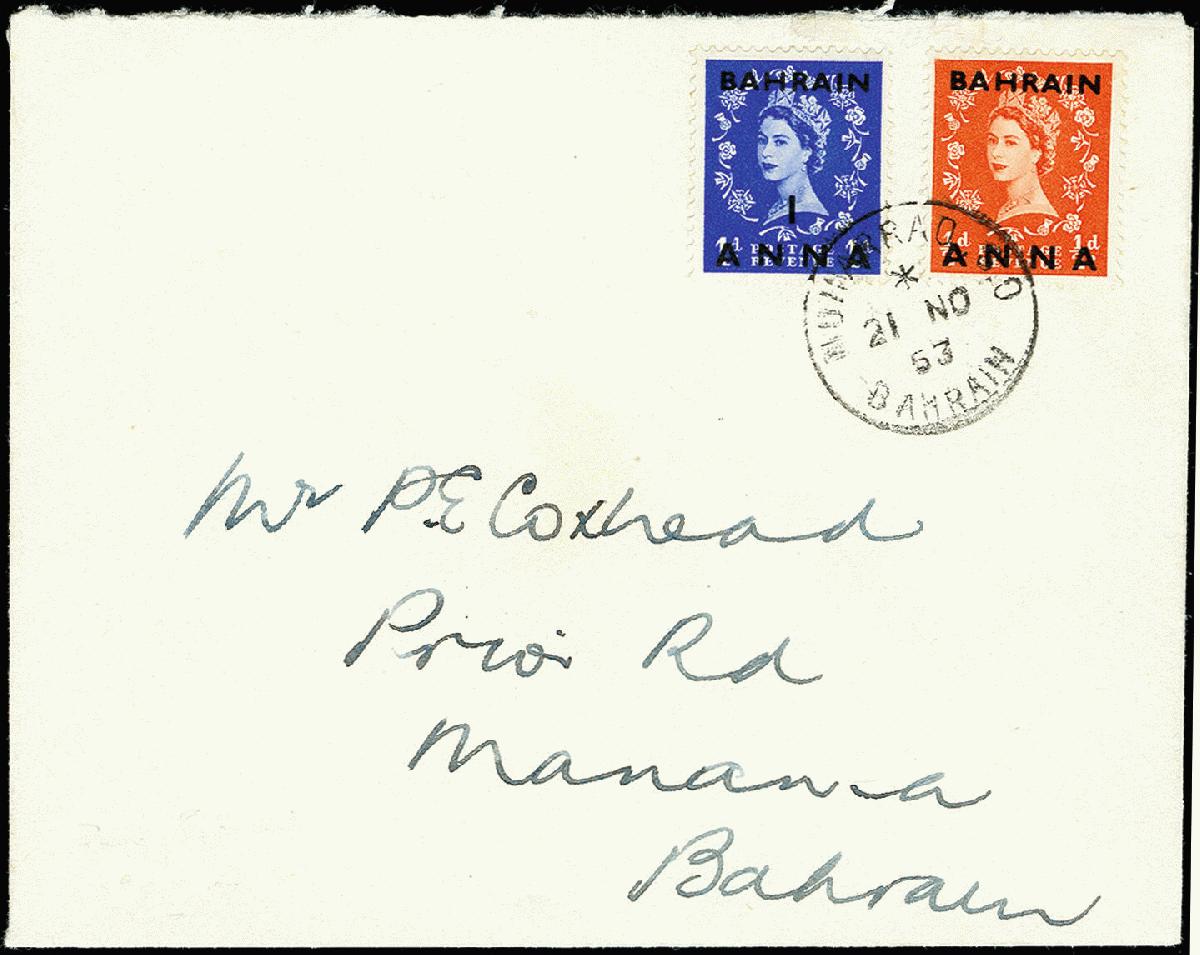 | Zusatzinformationen und Suchstichworte: | Heinrich Köhler 379. Auktion 19. - 24. September 2022 Los 1513 Bahrain Britische Periode ½ d. with "½" omitted, together with 1 a. on 1 d. tied by cds. "MUHARRAG P.O. BAHRAIN 21 NO 51", locally used; a very fine and rare cover, certificate BPA (1959) Zuschlag 226,00 EUR |