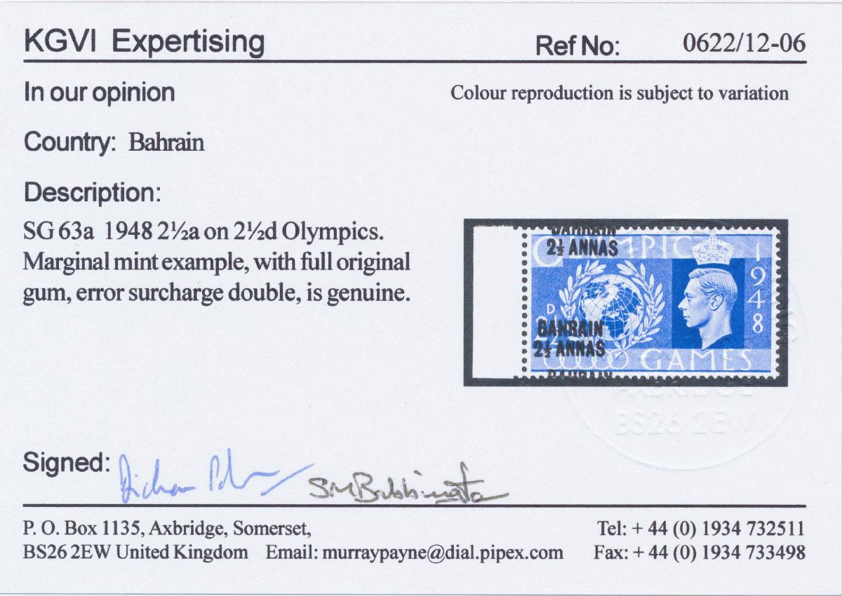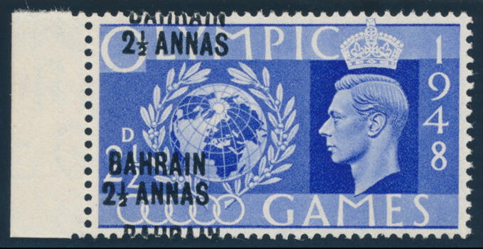| Zusatzinformationen und Suchstichworte: | Doreen Royan & Associates Shop - Online Los 750781 (D) Bahrain Bahrain 1948 King George VI 2½a. on 2½d. ultramarine Olympic Games issue of Great Britain. Surcharged with SG Type 5. Left marginal example. Variety, ‘Surcharge Double’. Superb unmounted mint condition. KGVI Expertising Certificate No. 0622/12-06 (2006). AN EXCEEDINGLY RARE ERROR WHICH ONLY OCCURRED ON A SINGLE SHEET. Festpreis 3.700,00 GBP |