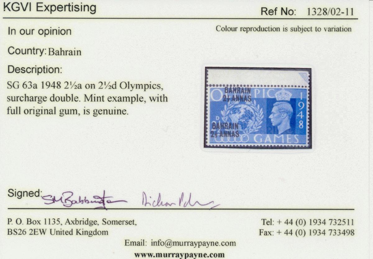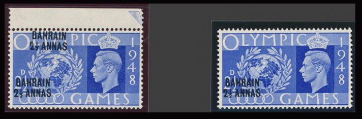 | Zusatzinformationen und Suchstichworte: | Doreen Royan & Associates Shop - Online Los 751577 Bahrain Bahrain 1948 King George VI Olympic Games 2½a. on 2½d. ultramarine. Top marginal example. Error, ‘Surcharge double’. Superb unmounted mint condition (with normal for comparison). KGVI Expertising Certificate (2011). RARE. Festpreis 3.500,00 GBP |
