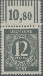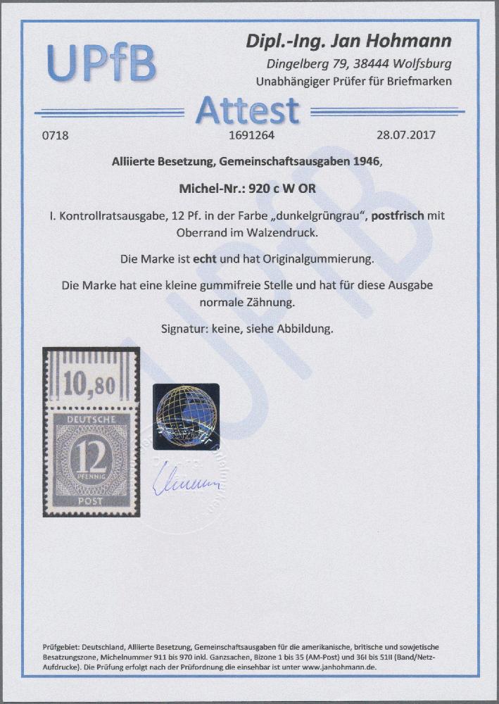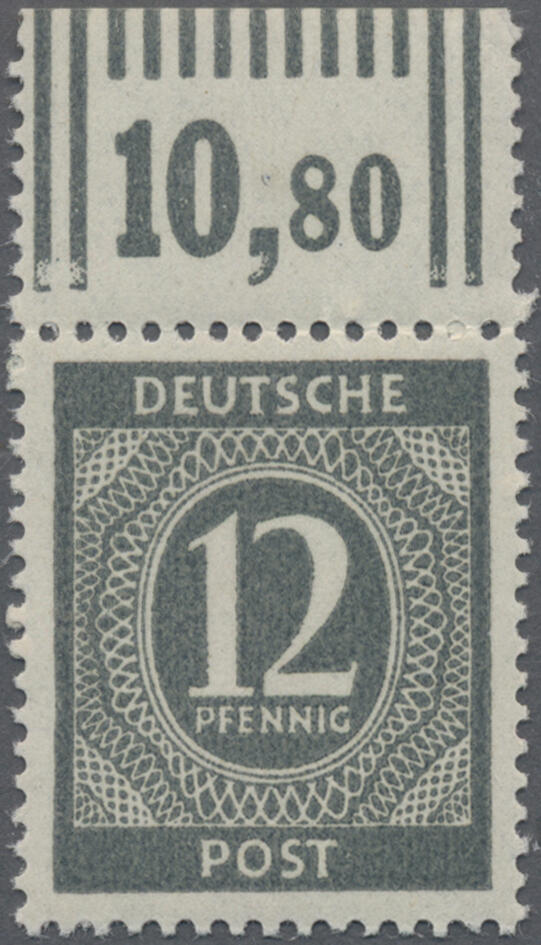 | Zusatzinformationen und Suchstichworte: | Christoph Gärtner 54. Auktion 19. Oktober 2022 Los 5809 D Gemeinschaftsausgaben 1946, 12 Pfg. Ziffer seltene Farbe dunkelgrüngrau, postfrisches Oberrandstück im Walzendruck, Fotoattest Hohmann (Mi€2.500,-) Ausruf 400,00 EUR |