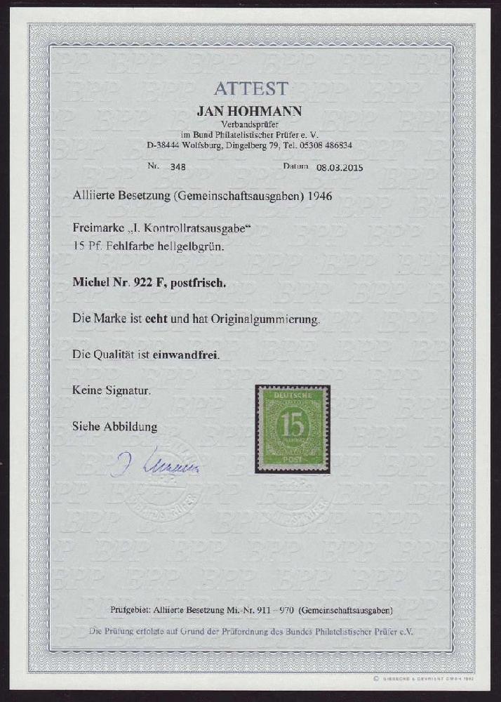 | Zusatzinformationen und Suchstichworte: | Christian E. Geigle Briefmarkenfachhandel Los 0002930126 Gemeinschaftsausgaben 1946, 1. Kontrollratsausgabe, 15 Pf. in der Fehlfarbe Hellgelbgrün, postfrisches Luxusstück, selten, unsigniert mit FA Hohmann "einwandfrei" Festpreis 350,00 EUR |