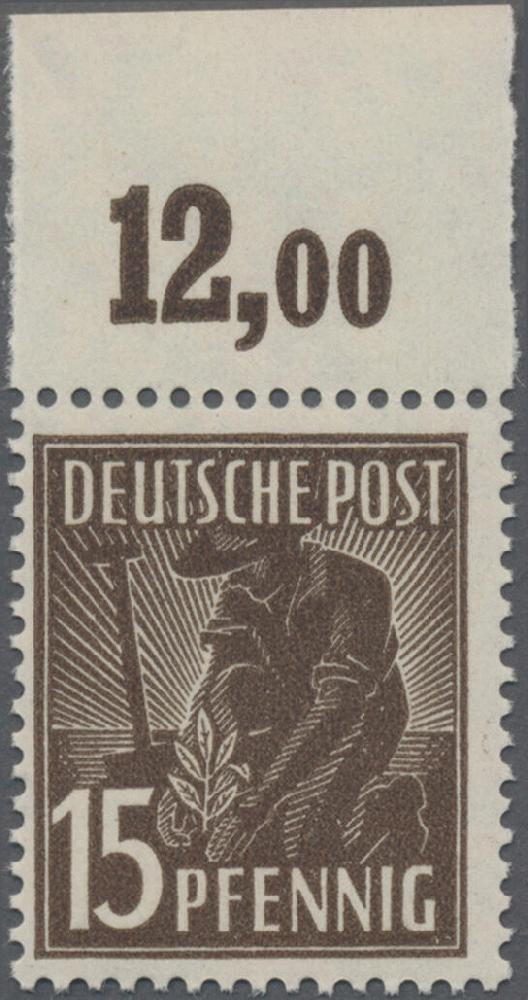 | Zusatzinformationen und Suchstichworte: | Christoph Gärtner 54. Auktion 19. Oktober 2022 Los 5842 D Gemeinschaftsausgaben 1947, 15 Pfg. Arbeiter in der sehr seltenen Farbe schwärzlichockerbraun, postfrisch vom Bogenoberrand mit nicht durchgezähntem Oberrand, Kalanderbüge sind herstellungsbedingt und kein Mangel, Fotoattest Hohmann BPP (Mi€1.500,-) Ausruf 300,00 EUR |