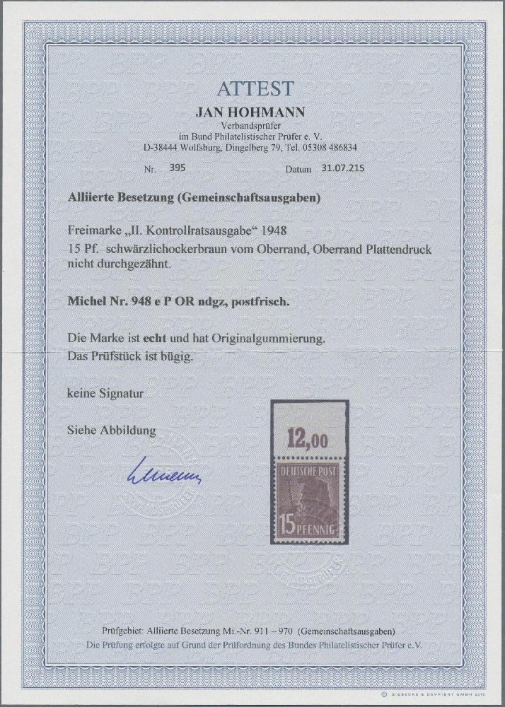 | Prüfer: | Hohmann, Jan (BPP (Bund Philatelistischer Prüfer)) |