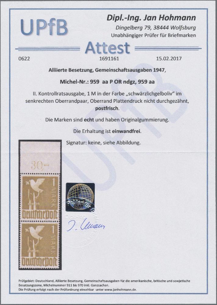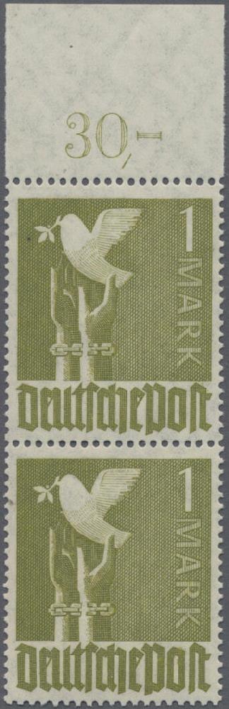| Zusatzinformationen und Suchstichworte: | Christoph Gärtner 54. Auktion 19. Oktober 2022 Los 5847 D Gemeinschaftsausgaben 1947, 1 Mark schwärzlichgelboliv im postfrischen senkrechten Oberrandpaar, Oberrand Plattendruck nicht durchgezähnt, "echt und einwandfrei", Fotoattest Hohmann (Mi€750,-) Ausruf 150,00 EUR |