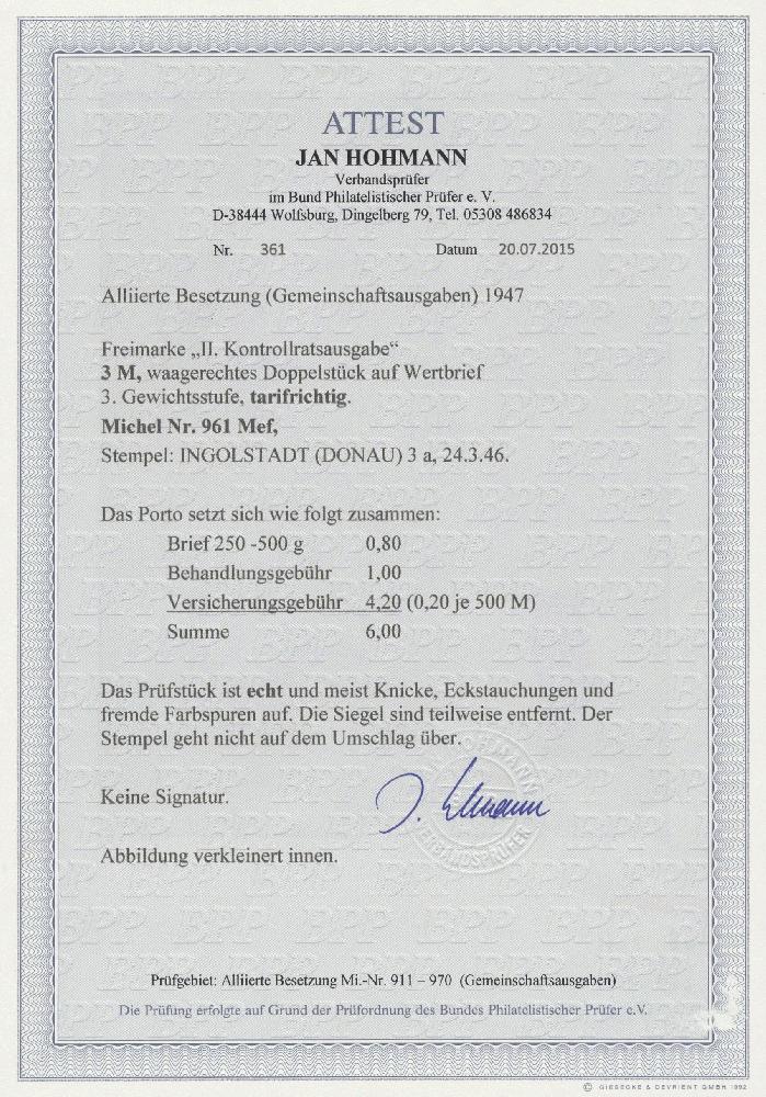 | Prüfer: | Hohmann, Jan (BPP (Bund Philatelistischer Prüfer)) |