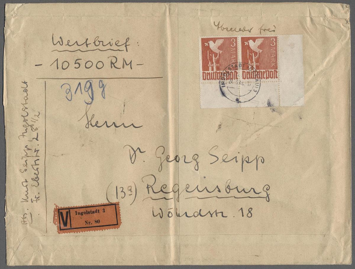 | Zusatzinformationen und Suchstichworte: | Auction Galleries Hamburg 25. Auktion 2. - 3. September 2022 Los 1413 Gemeinschaftsausgaben 1948, Taube 3 RM. bräunlichrot, waagerechtes Paar im unteren rechten Eckrandstück als portogerechte Frankatur eines Wertbriefs über 10.500 RM (Gewicht 319 gr.) aus Ingolstadt nach Regensburg. Marken vom Aufkleben etwas fleckig, unten rechts Büge durch Umschlagfalten, sonst einwandfrei. Beleg stärkere senkrechte Faltung und Beförderungsspuren, rs. AK Regensburg und fünf Siegel bzw. Siegelteile (zwei fehlen). Fotoattest Hohmann BPP (2015) Ausruf 300,00 EUR |