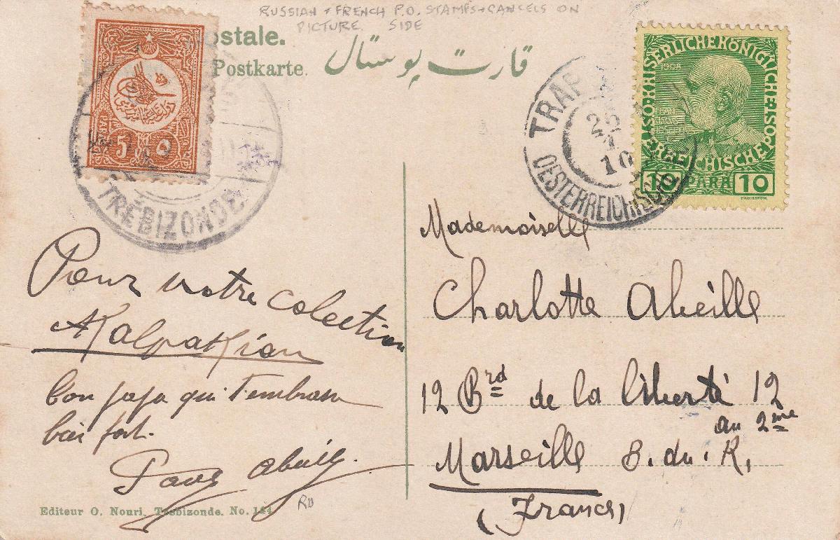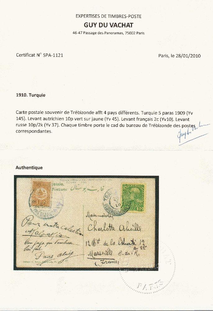 | Zusatzinformationen und Suchstichworte: | Tex Design, 1. Sonderpreisliste gültig bis 10.12.22 Los 820 Österreich Post in der Levante 1910, philat. frank. Pk. mit Frankatur von 4-Länder (Österr., Türkei, Russland, Frankreich), (Souvenier de Trebizonde), Attest Gauy du Vachat Festpreis 160,00 EUR |