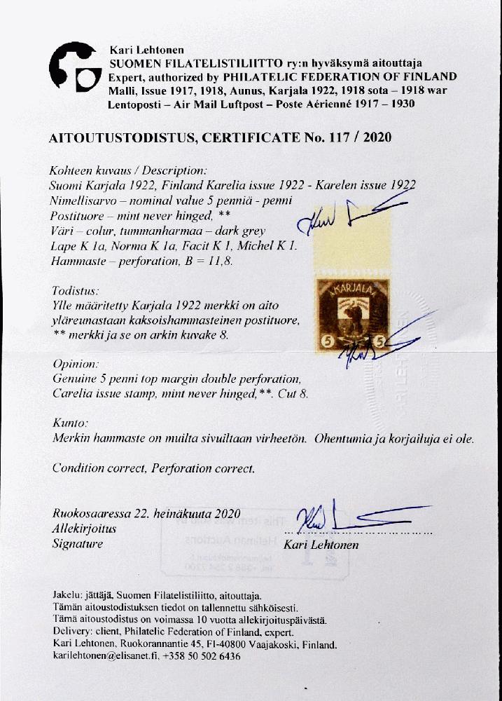 | Zusatzinformationen und Suchstichworte: | Hellman 126. Auktion 12. - 15. Oktober 2022 Los 2217 Karelien 5 penni B fein Doppelzähnung ab mit Bogenrand, postfrisch ** Attest: Lehtonen (2020) Ausruf 50,00 EUR |