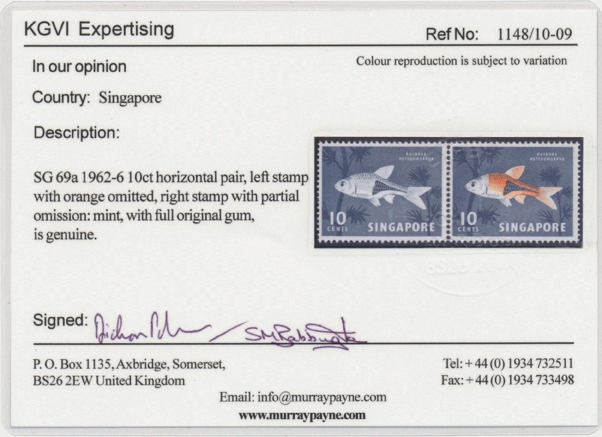 | Zusatzinformationen und Suchstichworte: | Doreen Royan & Associates Shop - Online Los 750859 (D) Singapur Singapore 1962-1966 Harlequinfish. 10c. red-orange and black. Horizontal pair. Error on left stamp, ‘Red-orange omitted and partial omission of red-orange on right stamp’. Superb unmounted mint condition. KGVI Expertising Certificate No. 11,481/10-09 (2009). RARE Festpreis 600,00 GBP |