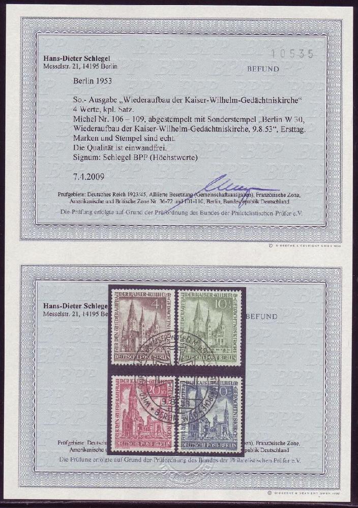 | Zusatzinformationen und Suchstichworte: | Christian E. Geigle Briefmarkenfachhandel Los 0001114044 Berlin 1953, Gedächtniskirche, 4 W. kpl. mit glasklaren ESSt. "BERLIN W 30 9.8.53", Luxus, FB Schlegel "einwandfrei" Festpreis 175,00 EUR |